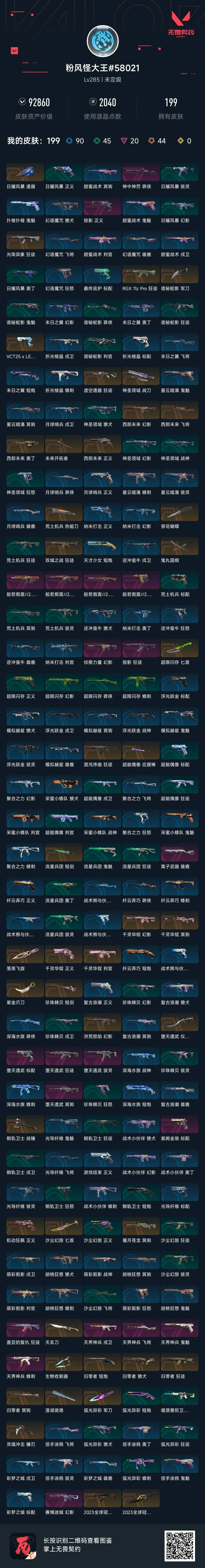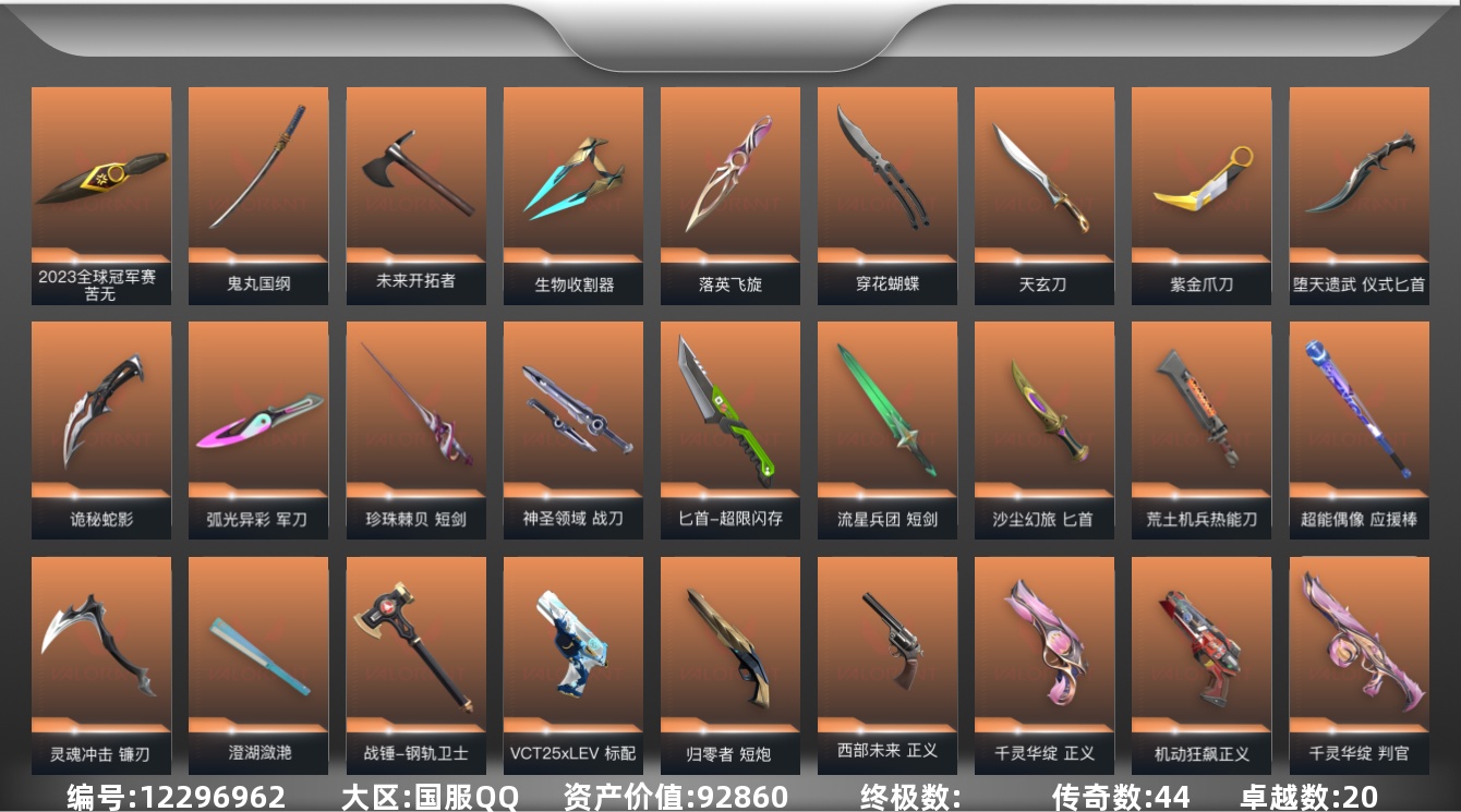 [12296962]44橙皮 20紫皮 199皮肤 27英雄 228卡面 2040已用源晶 未定级 优质装备:千灵华绽套装,天界神兵套装,堕天遗武套装,2023全球冠军赛套装,冥驹-偃月苍龙,狂徒-2023全球冠军赛,狂徒-归零者,冥驹-归零者,幻影-千灵华绽,冥驹-千灵华绽,狂徒-混沌序曲,狂徒-掠影,狂徒-盖亚的复仇,幻影-侦察力量,獠犬-归零者,正义-机动狂飙,冥驹-堕天遗武,幻影-洪荒怒焰,正义-千灵华绽,正义-掠影,标配-紫阙金琅,澄湖潋滟,镰刃-灵魂冲击,生物收割器,鬼魅-天界神兵,戍卫-天界神兵,飞将-天界神兵,天玄刀,紫金爪刀,堕天遗武 仪式匕首,判官-千灵华绽,落英飞旋,匕首-超限闪存,荒土机兵热能刀,鬼丸国纲,穿花蝴蝶,神圣领域 战刀,未来开拓者,诡秘蛇影,标配-堕天遗武,骇灵-堕天遗武,雄鹿-离子武器 亮点皮肤:苦无-2023全球冠军赛 套装:般若假面//2.0套装,西部未来,归零者套装 佩枪皮肤:狂怒-般若假面//2.0,标配-VCT25xLEV,正义-西部未来,短炮-归零者 冲锋枪皮肤:蜂刺-天界神兵 步枪皮肤:幻影-西部未来,狂徒-双城之战,狂徒-般若假面//2.0,狂徒-虚空遗器,獠犬-般若假面//2.0,狂徒-光荣异象,RGX 11z pro 狂徒,狂徒-堕天遗武,幻影-赛博迷城 狙击枪皮肤:飞将-西部未来,莽侠-神中神罚 机枪皮肤:奥丁-西部未来,战神-般若假面//2.0 近战武器皮肤:战锤-钢轨卫士,短剑-流星兵团,短剑-珍珠棘贝,匕首-沙尘幻旅,超能偶像 应援棒,军刀-弧光异彩
