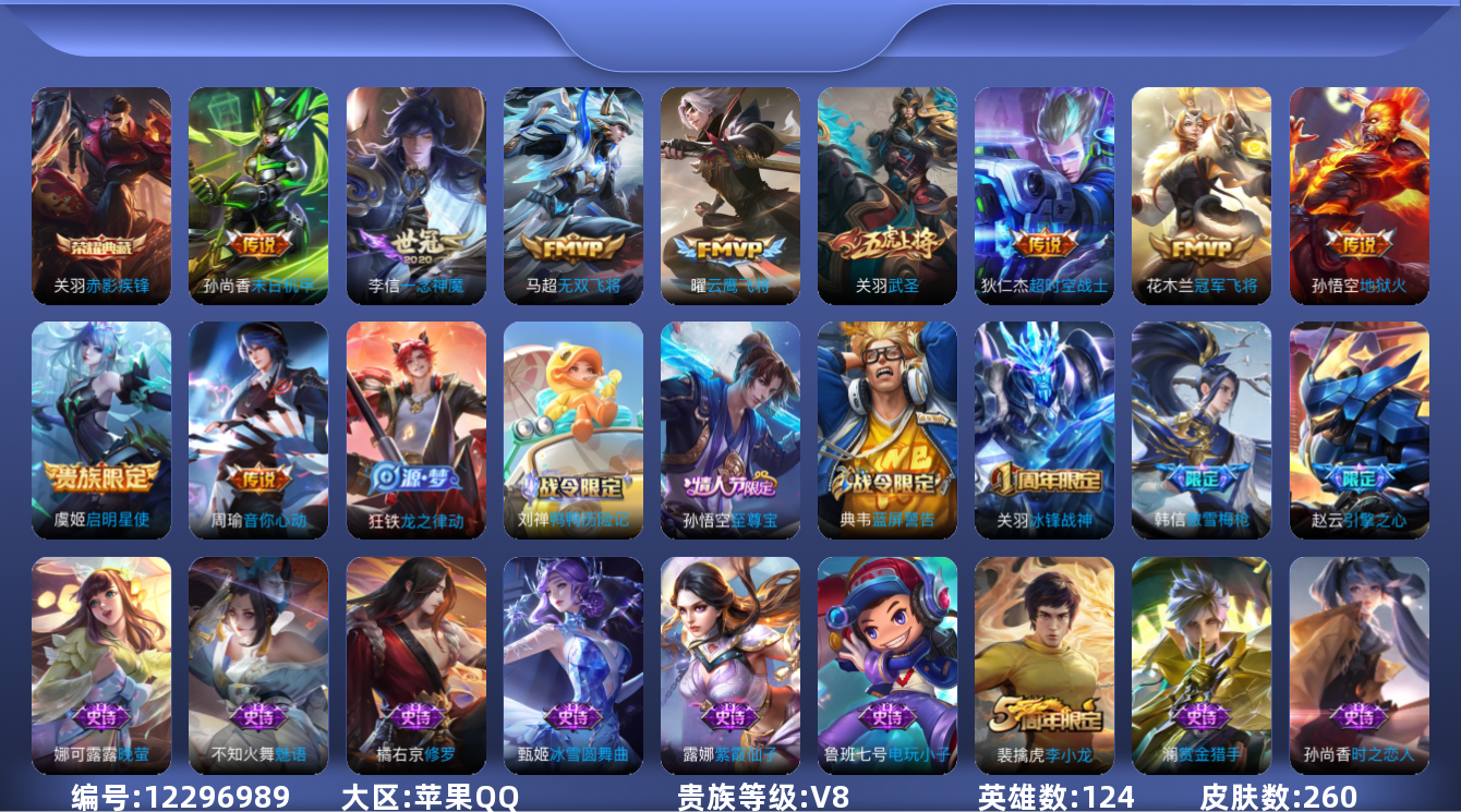 [12296989]V8 1典藏 10传说 124英雄 260皮肤 典藏英雄武则天 可修改实名 优质装备:赤影疾锋,冠军飞将,云鹰飞将(小将军),一念神魔,末日机甲-孙尚香(绿蚂蚱),地狱火,音你心动-周瑜,超时空战士-狄仁杰,无双飞将 珍宝阁皮:蔷薇恋人,女武神 限定皮:至尊宝,傲雪梅枪,五谷丰年,冰锋战神,幽恒(沐浴露),武圣,梁祝,李小龙,引擎之心 史诗皮:鸭鸭历险记-刘禅,龙之律动,紫霞仙子,苍穹之光,电玩小子(小书包),特工魅影,千年之狐,永昼,龙骑士(小龙虾),蒙恬荣光圣徽,晚萤,魅语,冰冠公主,偶像歌手,电玩·爆裂旋风,百相守梦(关羽),时之恋人-孙尚香,乱世虎臣,修罗,摇滚巨星,水果甜心,星夜王子,暗隐猎兽者,幽灵船长,鬼剑武藏,天秀·启明,地狱岩魂,繁星吟游(呼啦呼啦),拒霜思,缤纷独角兽,乘风破浪,逐浪之夏,水晶猎龙者,金属风暴,原初追逐者,圣诞狂欢,圣诞恋歌,鹰眼统帅,魅力维加斯,黎明之约,赏金猎手,未来纪元-赵云