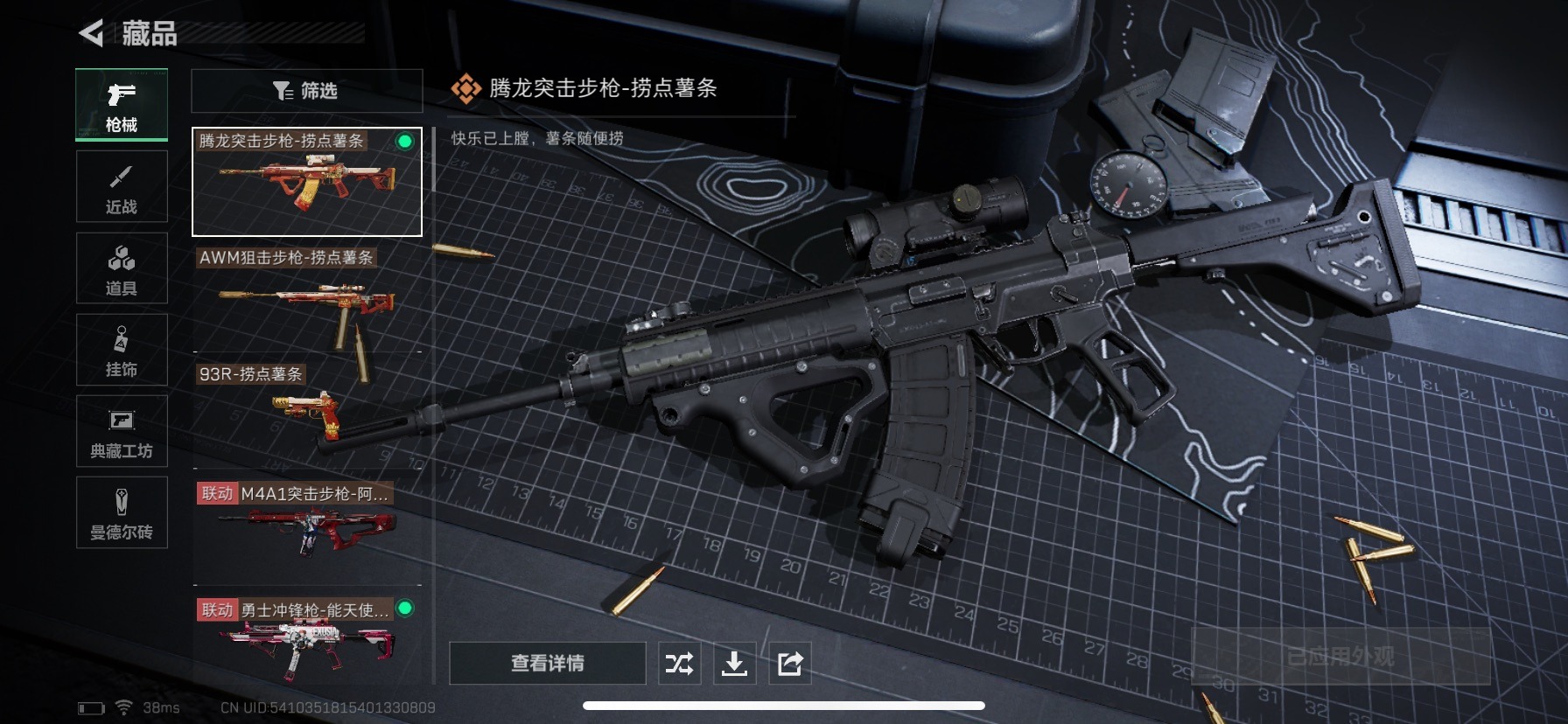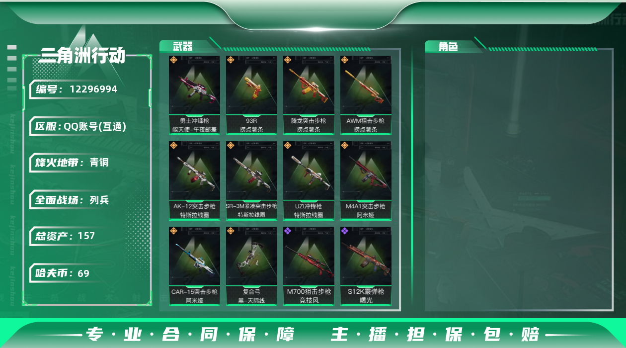 [12296994]总资产:157.1M 10传说枪械 哈夫币:69.781K 进阶安全箱(9.17到期) 可二次 可修改实名 烽火地带段位:青铜 全面战场段位:列兵 传说武器皮肤:M4A1突击步枪-阿米娅,CAR-15突击步枪-阿米娅,复合弓-黑-天际线,AWM狙击步枪-捞点薯条,腾龙突击步枪-捞点薯条,93R-捞点薯条,AK-12突击步枪-特斯拉线圈,SR-3M紧凑突击步枪-特斯拉线圈,UZI冲锋枪-特斯拉线圈,勇士冲锋枪-能天使-午夜邮差 史诗武器皮肤:SV-98狙击步枪-林中猎手,SCAR-H战斗步枪-囚徒,S12K霰弹枪-曙光,M700狙击步枪-竞技风