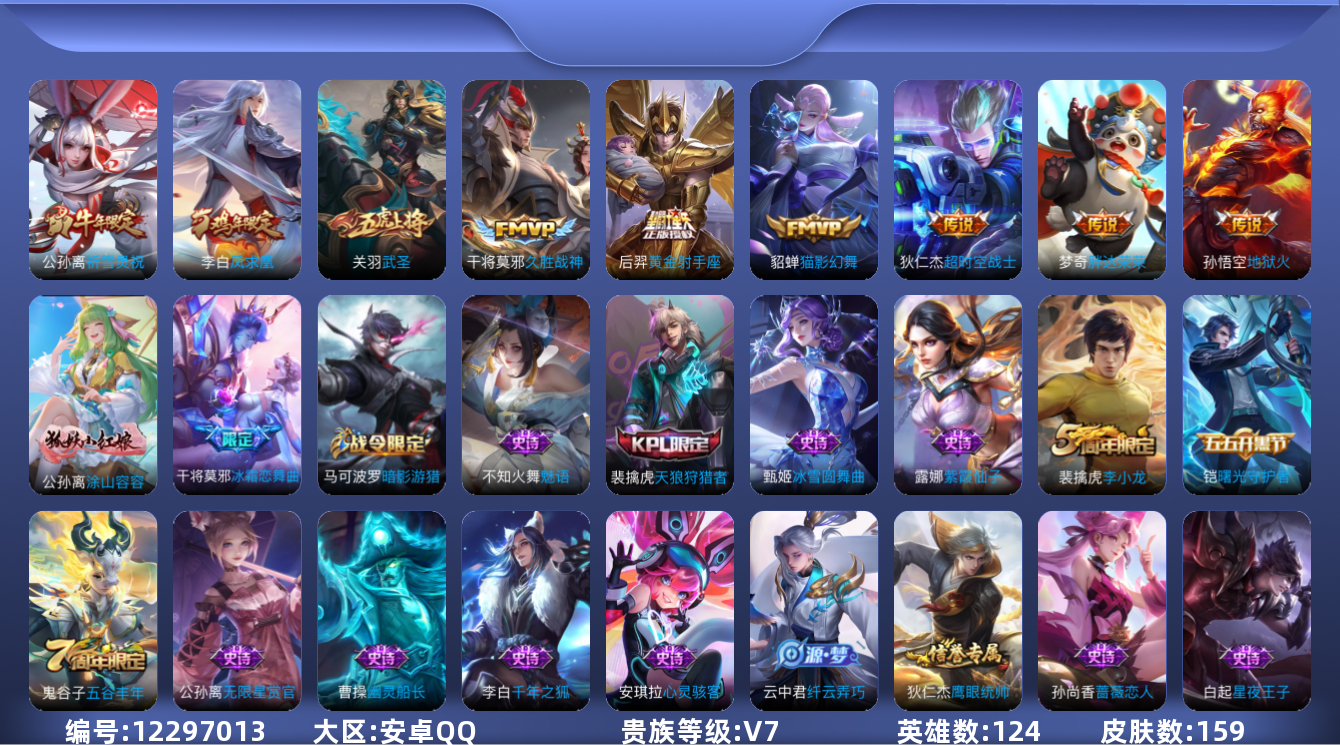 - [11632426]V7 1典藏 16传说 116英雄 215皮肤 可修改实名 优质装备:全息碎影(猴子典藏),黄金狮子座,黄金射手座,云鹰飞将(小将军),绛天战甲(鸡嘴战神),黄金白羊座,猫影幻舞,久胜战神,一念神魔,末日机甲-孙尚香(绿蚂蚱),地狱火,零号·赤焰,地狱之眼 珍宝阁皮:蔷薇恋人 限定皮:至尊宝,凤求凰(白切鸡),太华(伽罗年限),时之彼端,白晶晶,时雨天司(水龙头),神威(电光马子),飞衡(韩信年限),玄嵩(庄周年限),遇见飞天,幽恒(沐浴露),武圣,天狼运算者,梁祝,御风骁将(吕布年限),岱宗(典韦年限),天狼溯光者,虎魄,天狼绘梦者,李小龙,如梦令-嫦娥,如梦令-后羿,霸王别姬-虞姬,孙行者,大圣娶亲,青春决赛季,冰霜恋舞曲,神奇女侠 史诗皮:遇见神鹿,紫霞仙子,电玩小子(小书包),白龙吟,特工魅影,千年之狐,偶像歌手,白蛇,暗夜猫娘,无限星赏官,晚萤,冰冠公主,青蛇,时之恋人-孙尚香,修罗,水果甜心,天才门将,星夜王子,时之奇旅-安琪拉,功夫厨神,暗隐猎兽者,幽灵船长,鬼剑武藏,地狱岩魂,纤云弄巧,繁星吟游(呼啦呼啦),拒霜思,乘风破浪,逐浪之夏,曙光守护者,箭羽风息,金属风暴,鹰眼统帅,魅力维加斯