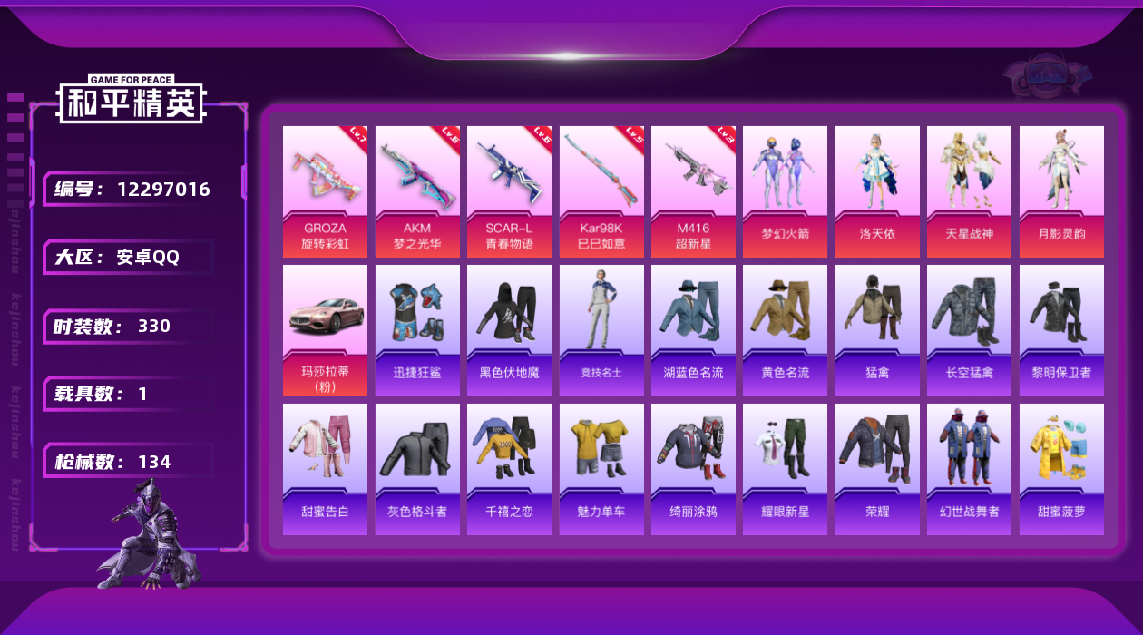 - PX_2090598- 可二次 安卓手Q-17王牌印记-9粉装-7特效枪-1载具-102357热力值-221套装-298枪皮-3卓越印记-0传奇印记, 【9粉装】,宝贝奶油派,放客神游,星穹咏叹调,绯穹魔姬,恐龙拽拽,复仇流浪者,守护天翼,莲影清波,粉色回忆, 【7特效枪】,AKM-绿萝繁花-5级,SCAR-L-锦绣绵绵-5级,M416-五爪金龙-7级,M416-电玩时刻-5级,AUG-暖羊咩咩-