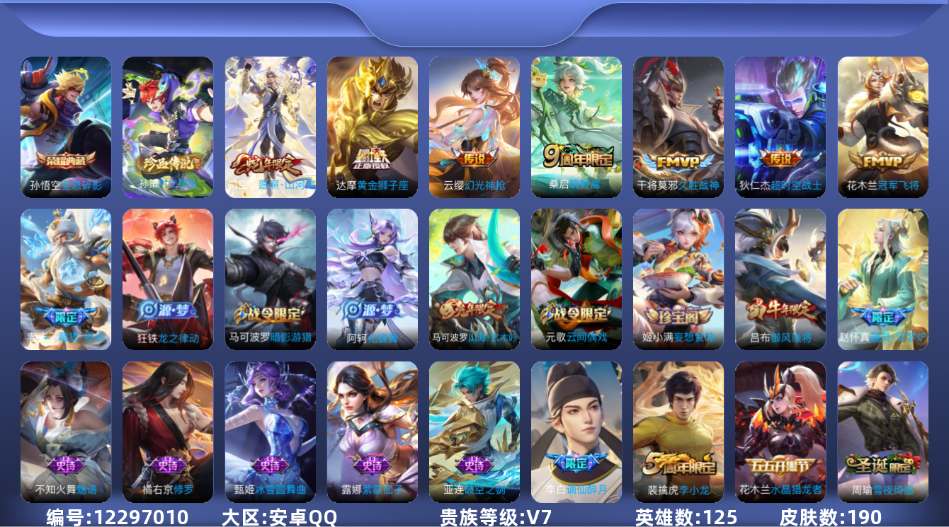 - [11571263]V7 11传说 123英雄 113皮肤 可修改实名 优质装备:猫影幻舞,一念神魔,末日机甲-孙尚香(绿蚂蚱),仲夏夜之梦(大飞蛾),无双飞将,山海·炽霜斩(李信年限) 珍宝阁皮:蔷薇恋人 限定皮:逐霄战戟,鸣野蒿,前尘镜,瑞麟志(木兰年限),诗剑行,齐天大圣,五谷丰年,李小龙,热情桑巴,枫霜尽 史诗皮:鸭鸭历险记-刘禅,龙之律动,百相守梦-黄忠,紫霞仙子,黄金分割率,江河有灵,晚萤,龙骑士(小龙虾),末日机甲-吕布,摇滚巨星,水果甜心,功夫厨神,暗隐猎兽者,鬼剑武藏,逐浪之夏,曙光守护者,箭羽风息,圣诞狂欢,魅力维加斯,无心,未来纪元-赵云