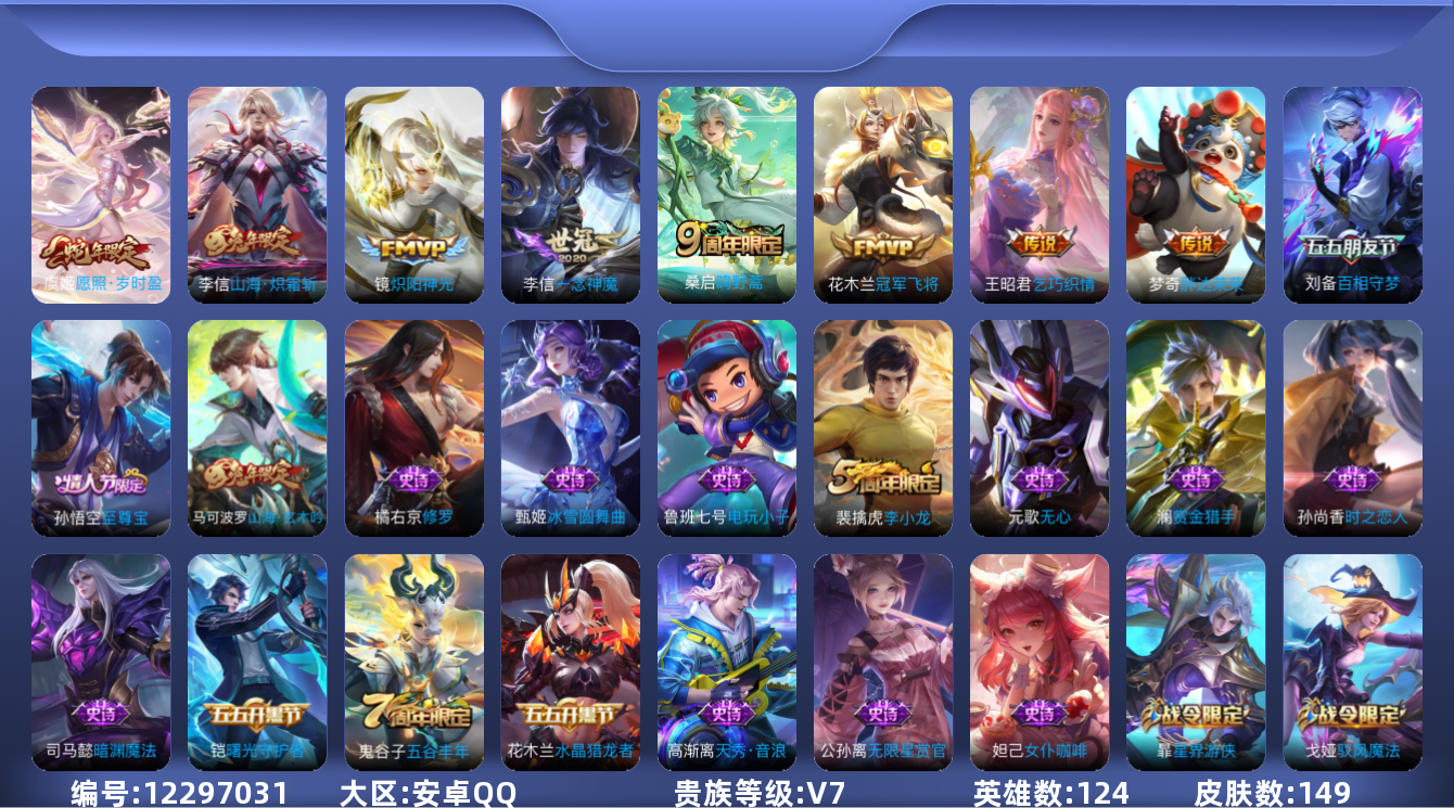 [12297031]V7 8传说 124英雄 149皮肤 可修改实名 优质装备:冠军飞将,炽阳神光,一念神魔,胖达荣荣,乞巧织情,山海·炽霜斩(李信年限) 珍宝阁皮:胡桃夹子 限定皮:愿照·岁时盈(虞姬年限),鸣野蒿,至尊宝,五谷丰年,李小龙,神器·万象笔,山海·玄木吟(马可年限) 史诗皮:电玩小子(小书包),黄金分割率,江河有灵,无限星赏官,冰冠公主,偶像歌手,百相守梦(刘备),时之恋人-孙尚香,节奏热浪,修罗,女仆咖啡,水果甜心,星夜王子,心灵骇客,功夫厨神,暗隐猎兽者,鬼剑武藏,暗渊魔法,纤云弄巧,缤纷独角兽,水晶猎龙者,曙光守护者,热力回旋,箭羽风息,金属风暴,鹰眼统帅,暗夜贵公子,魅力维加斯,赏金猎手,天秀·音浪,无心,未来纪元-赵云,玫瑰异探
