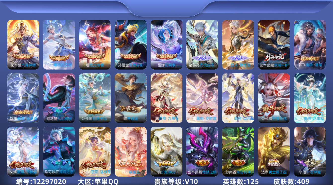 - [12147591]V9 5典藏 1珍品传说 35传说 125英雄 432皮肤 可修改实名 优质装备:鸣剑·曳影,九霄神辉(木兰典藏),赤影疾锋,弑枪猎影(韩信典藏),神鉴启示录,怪盗基德,黄金狮子座,黄金射手座,云鹰飞将(小将军),绛天战甲(鸡嘴战神),黄金白羊座,久胜战神,炽阳神光,一念神魔,末日机甲-孙尚香(绿蚂蚱),仲夏夜之梦(大飞蛾),地狱之眼,飞鸢探春,时之恋人-刘备(电焊工),超时空战士-狄仁杰,末日机甲-孙策,无双飞将,浮生妄,妄想实况,澜逐花归海,黄金天蝎座,涂山容容 传说皮:乘龙·铭钟鼎(赵云年限),铠冥王哈迪斯,幻光神枪 珍宝阁皮:妄想食味,胡桃夹子,优雅恋人 限定皮:愿照·九州拓(澜年限),愿照·众生和(妲己年限),逐霄战戟,映山客,陌上桑,鸣野蒿,夏侯惇霜北刀,至尊宝,白虎志(电光耗子),傲雪梅枪,时雨天司(水龙头),飞衡(韩信年限),匿光决锋者,怒海麟威,五谷丰年,冰锋战神,武圣,梁祝,御风骁将(吕布年限),李小龙,朱雀志(守约年限),默契交锋-花木兰,大圣娶亲,寅虎·赤拳(老虎年限),启示之音 史诗皮:鸭鸭历险记-刘禅,苍鳞隐世,器灵·浮梦炉,糖绘人间,绮世丹青,瑰影绮梦,化蝶舞,灵蛊蚀心,星界战将,谪仙醉月,龙之律动,雪豹·霜爪,百相守梦-周瑜,茶境仙,怒海争锋,炽弈燎原,撼地雄心,破空之剑,战舞者,涂山红红,东方月初,埋骨钱,芈月浮光幕影,海诺心动手记,琥珀纪元伽罗,决胜骁骑,蔬乡物语(鲁班七号),百相守梦-百里守约,星界特工,百相守梦-黄忠,守夜人,紫霞仙子,苍穹之光,电玩小子(小书包),黄金分割率,特工魅影,千年之狐,永昼,江河有灵,魅语,百解令(蒙犽),高渐离燃音魔法,蒙恬荣光圣徽,无限星赏官,匿光破解者,冰冠公主,偶像歌手,白蛇,晚萤,暗夜猫娘,银翎春语,龙骑士(小龙虾),末日机甲-吕布,猫狗日记-孙策,猫狗日记-大乔,乱世虎臣,节奏热浪,修罗,女仆咖啡,摇滚巨星,水果甜心,绅士熊喵,天才门将,星夜王子,心灵骇客,功夫厨神,德古拉伯爵,暗隐猎兽者,幽灵船长,鬼剑武藏,暗渊魔法,心灵战警,乐园奇幻夜,天秀·启明,舞动绿茵,地狱岩魂,纤云弄巧,拒霜思,缤纷独角兽,乘风破浪,逐浪之夏,月团寄思,水晶猎龙者,曙光守护者,箭羽风息,金属风暴,原初追逐者,圣诞狂欢,圣诞恋歌,鹰眼统帅,暗夜贵公子,魅力维加斯,黎明之约,雪上飞焰,赏金猎手,滕王阁序,无心