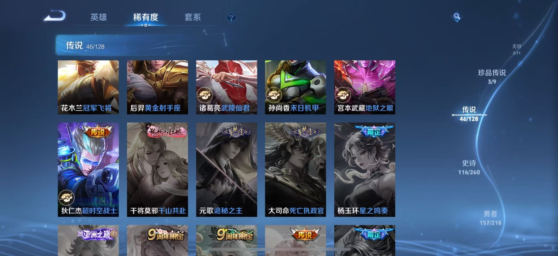 铠绛天战甲,刘备时之恋人,赵云淬星耀世,干将莫邪久胜战神,典韦战鼓燎原,小乔音你心动,李信一念神魔,孙策挚爱之约,达摩黄金狮子座,海月金乌负日,王昭君乞巧织情,露娜霜月吟,吕布遇见神鼓,后羿千劫归真,镜炽阳神光,周瑜音你心动,宫本武藏惊梅引,裴擒虎祥瑞亨通,貂蝉猫影幻舞,艾琳觅芳踪,西施续相思,曜云鹰飞将,曜李逍遥,马超无双飞将,墨子黄金天蝎座,云缨幻光神枪