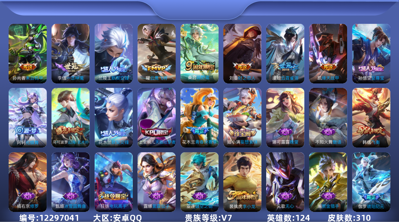 [12297041]V7 8传说 124英雄 310皮肤 可修改实名 优质装备:云鹰飞将(小将军),绛天战甲(鸡嘴战神),一念神魔,云霓雀翎,末日机甲-孙尚香(绿蚂蚱),时之恋人-刘备(电焊工),天秀幻梦 珍宝阁皮:妄想食味,玩趣恶龙 限定皮:逐霄战戟,鸣野蒿,至尊宝,飞衡(韩信年限),五谷丰年,梁祝,虎魄,天狼绘梦者,李小龙,默契交锋-兰陵王,默契交锋-花木兰,青春决赛季,唐三藏,山海·玄木吟(马可年限) 史诗皮:化蝶舞,星界战将,撼地雄心,破空之剑,蒙犽顽岩魄,芈月浮光幕影,琥珀纪元伽罗,蔬乡物语(鲁班七号),百相守梦-百里守约,紫霞仙子,黄金分割率,特工魅影,千年之狐,永昼,江河有灵,魅语,百解令(蒙犽),高渐离燃音魔法,蒙恬荣光圣徽,匿光破解者,冰冠公主,青蛇,偶像歌手,晚萤,电玩·爆裂旋风,末日机甲-吕布,猫狗日记-孙策,猫狗日记-大乔,节奏热浪,修罗,女仆咖啡,水果甜心,绅士熊喵,天才门将,星夜王子,心灵骇客,德古拉伯爵,暗隐猎兽者,幽灵船长,鬼剑武藏,暗渊魔法,心灵战警,天秀·启明,舞动绿茵,地狱岩魂,拒霜思,缤纷独角兽,乘风破浪,逐浪之夏,水晶猎龙者,金属风暴,原初追逐者,圣诞狂欢,圣诞恋歌,鹰眼统帅,黎明之约,赏金猎手,奇遇舞章,天秀幻梦,无心,未来纪元-赵云,玫瑰异探