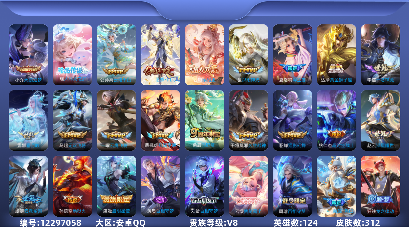 [12297058]V8 1典藏 1珍品传说 19传说 124英雄 312皮肤 可修改实名 优质装备:天鹅之梦(小乔典藏),大耳狗之梦,黄金狮子座,云鹰飞将(小将军),猫影幻舞,久胜战神,炽阳神光,一念神魔,云霓雀翎,地狱火,淬星耀世,超时空战士-狄仁杰,无双飞将,浮生妄,霜月吟 传说皮:云诺千山,续相思,祥瑞亨通 珍宝阁皮:妄想食味 限定皮:愿照·山河定(司空震年限),逐霄战戟,陌上桑,鸣野蒿,白晶晶,飞衡(韩信年限),瑞麟志(木兰年限),青龙志(铠年限),冰锋战神,游园惊梦,梁祝,逐梦之翼,逐梦之光,一生所爱,大圣娶亲,青春决赛季,热情桑巴,神奇女侠 史诗皮:赞萌露比,鸭鸭历险记-刘禅,器灵·浮梦炉,化蝶舞,龙之律动,藏狐·褐绒,百相守梦-周瑜,茶境仙,破空之剑,蔬乡物语(鲁班七号),百相守梦-百里守约,星界特工,百相守梦-黄忠,紫霞仙子,白龙吟,黄金分割率,特工魅影,千年之狐,永昼,魅语,冰冠公主,偶像歌手,白蛇,百相守梦(刘备),猫狗日记-孙策,猫狗日记-大乔,时之恋人-孙尚香,乱世虎臣,修罗,女仆咖啡,水果甜心,天才门将,星夜王子,心灵骇客,德古拉伯爵,暗隐猎兽者,幽灵船长,鬼剑武藏,暗渊魔法,心灵战警,乐园奇幻夜,天秀·启明,地狱岩魂,繁星吟游(呼啦呼啦),缤纷独角兽,乘风破浪,逐浪之夏,箭羽风息,金属风暴,原初追逐者,圣诞狂欢,圣诞恋歌,鹰眼统帅,暗夜贵公子,魅力维加斯,赏金猎手