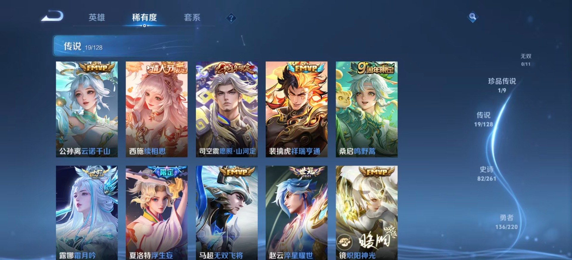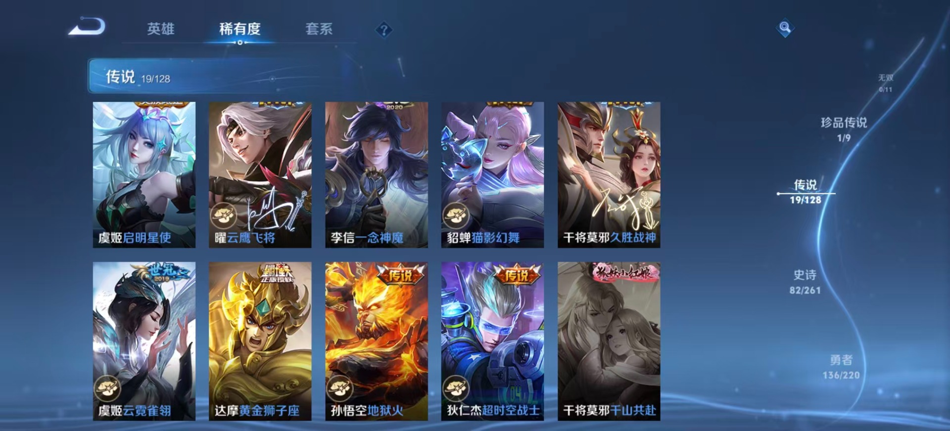 - PX_2108150-Q/绝世王者/379皮肤/126英雄/2典藏/0珍品无双/1无双/4珍品传说/24传说/115史诗/10稀有英雄 【4 珍品传说】酷洛米之心 安琪拉,大耳狗之梦 瑶,怪盗基德 马可波罗,兔狲·蓬尾 张飞, 【2 典藏皮肤】倪克斯神谕 武则天,弑枪猎影 韩信, 【1 无双皮肤】花合斗 不知火舞, 【24 传说皮肤】启明星使 虞姬,白虎志 百里玄策,云鹰飞将 曜,游龙清影 西施,