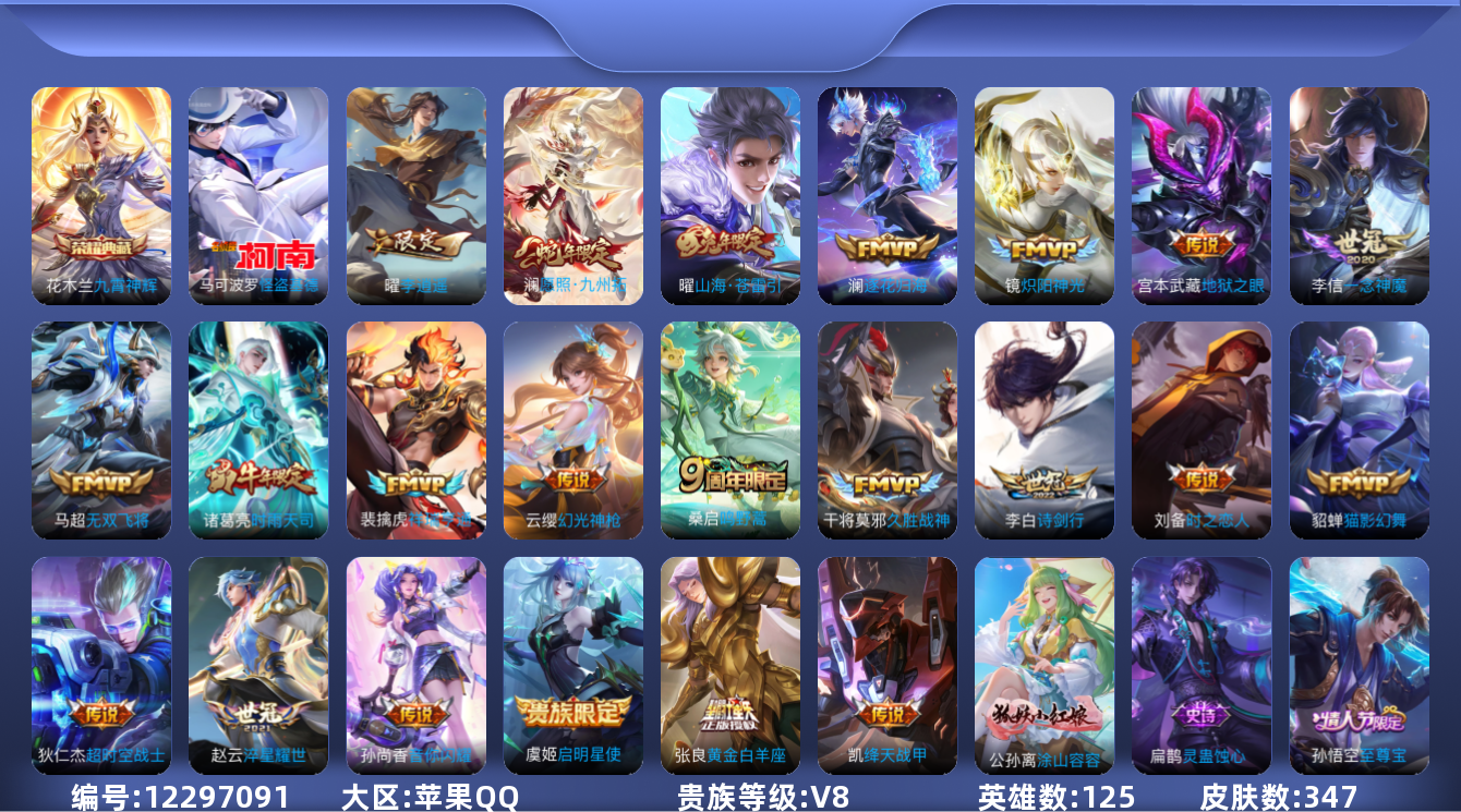 [12297091]V8 1典藏 1珍品传说 22传说 125英雄 347皮肤 可修改实名 优质装备:九霄神辉(木兰典藏),怪盗基德,绛天战甲(鸡嘴战神),黄金白羊座,猫影幻舞,久胜战神,炽阳神光,一念神魔,地狱之眼,李逍遥,时之恋人-刘备(电焊工),淬星耀世,超时空战士-狄仁杰,无双飞将,音你闪耀(rap皮),山海·苍雷引(电光曜子),澜逐花归海 传说皮:祥瑞亨通,幻光神枪 珍宝阁皮:妄想食味,优雅恋人,蔷薇恋人 限定皮:愿照·九州拓(澜年限),鸣野蒿,至尊宝,傲雪梅枪,白晶晶,时雨天司(水龙头),神威(电光马子),飞衡(韩信年限),玄嵩(庄周年限),遇见飞天,高山流水,诗剑行,五谷丰年,冰锋战神,梁祝,岱宗(典韦年限),李小龙,逐梦之影,朱雀志(守约年限),默契交锋-花木兰,孙行者,玉兔公主 史诗皮:灵蛊蚀心,星界战将,谪仙醉月,茶境仙,百相守梦-百里守约,紫霞仙子,白龙吟,黄金分割率,特工魅影,千年之狐,永昼,江河有灵,魅语,百解令(蒙犽),高渐离燃音魔法,蒙恬荣光圣徽,青蛇,偶像歌手,电玩·爆裂旋风,暗夜猫娘,百相守梦(关羽),龙骑士(小龙虾),末日机甲-吕布,猫狗日记-孙策,猫狗日记-大乔,乱世虎臣,节奏热浪,修罗,女仆咖啡,摇滚巨星,水果甜心,绅士熊喵,天才门将,星夜王子,心灵骇客,功夫厨神,德古拉伯爵,暗隐猎兽者,幽灵船长,鬼剑武藏,心灵战警,乐园奇幻夜,舞动绿茵,地狱岩魂,诗语江南,繁星吟游(呼啦呼啦),拒霜思,缤纷独角兽,乘风破浪,逐浪之夏,水晶猎龙者,曙光守护者,箭羽风息,金属风暴,原初追逐者,圣诞狂欢,圣诞恋歌,鹰眼统帅,暗夜贵公子,魅力维加斯,黎明之约,无心,未来纪元-赵云