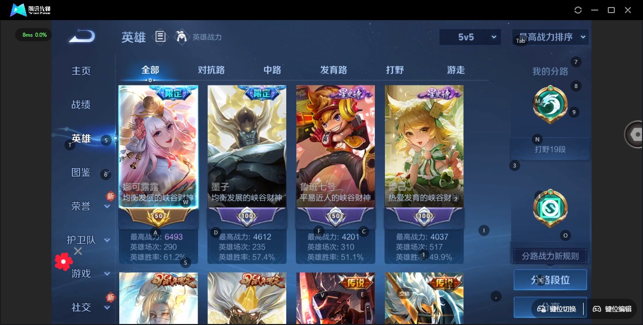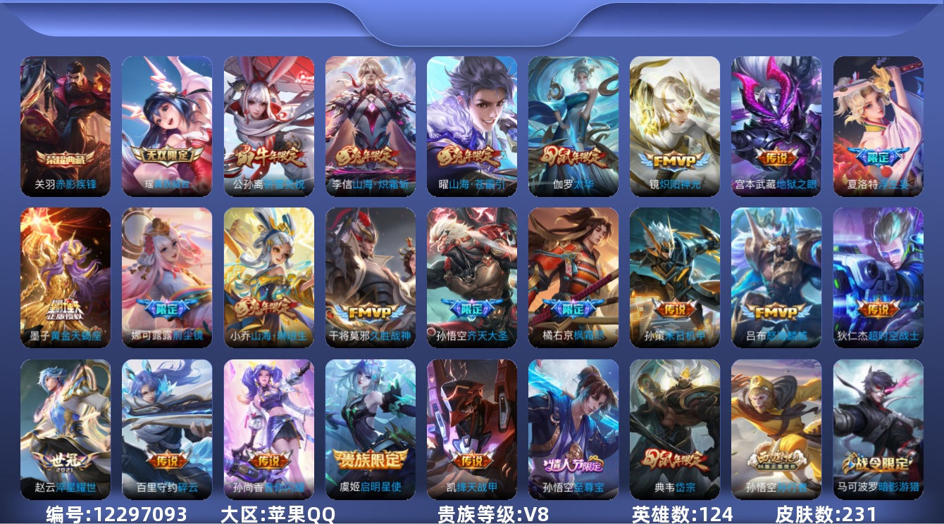 - [11677605]V8 11传说 124英雄 293皮肤 可修改实名 女号 优质装备:黄金射手座,久胜战神,地狱火,零号·赤焰,地狱之眼,时之恋人-刘备(电焊工) 传说皮:幻光神枪 珍宝阁皮:妄想食味,优雅恋人 限定皮:鸣野蒿,至尊宝,白虎志(电光耗子),凤求凰(白切鸡),傲雪梅枪,神威(电光马子),飞衡(韩信年限),五谷丰年,冰锋战神,天狼运算者,梁祝,御风骁将(吕布年限),逐梦之星,岱宗(典韦年限),天狼溯光者,李小龙,朱雀志(守约年限),如梦令-嫦娥,如梦令-后羿,孙行者,大圣娶亲,乒乒小将,寅虎·心曲(虎婆) 史诗皮:茶境仙,鸭鸭历险记-刘禅,龙之律动,百相守梦-百里守约,百相守梦-黄忠,百相守梦-周瑜,化蝶舞,紫霞仙子,电玩小子(小书包),白龙吟,黄金分割率,特工魅影,千年之狐,江河有灵,雪夜绮愿(周瑜),百解令(蒙犽),冰冠公主,晚萤,末日机甲-吕布,猫狗日记-孙策,猫狗日记-大乔,时之恋人-孙尚香,乱世虎臣,节奏热浪,修罗,女仆咖啡,摇滚巨星,水果甜心,绅士熊喵,天才门将,星夜王子,功夫厨神,德古拉伯爵,暗隐猎兽者,幽灵船长,鬼剑武藏,乐园奇幻夜,天秀·启明,舞动绿茵,纤云弄巧,拒霜思,缤纷独角兽,乘风破浪,龙鼓争鸣,水晶猎龙者,曙光守护者,热力回旋,箭羽风息,金属风暴,圣诞恋歌,鹰眼统帅,无心,未来纪元-赵云