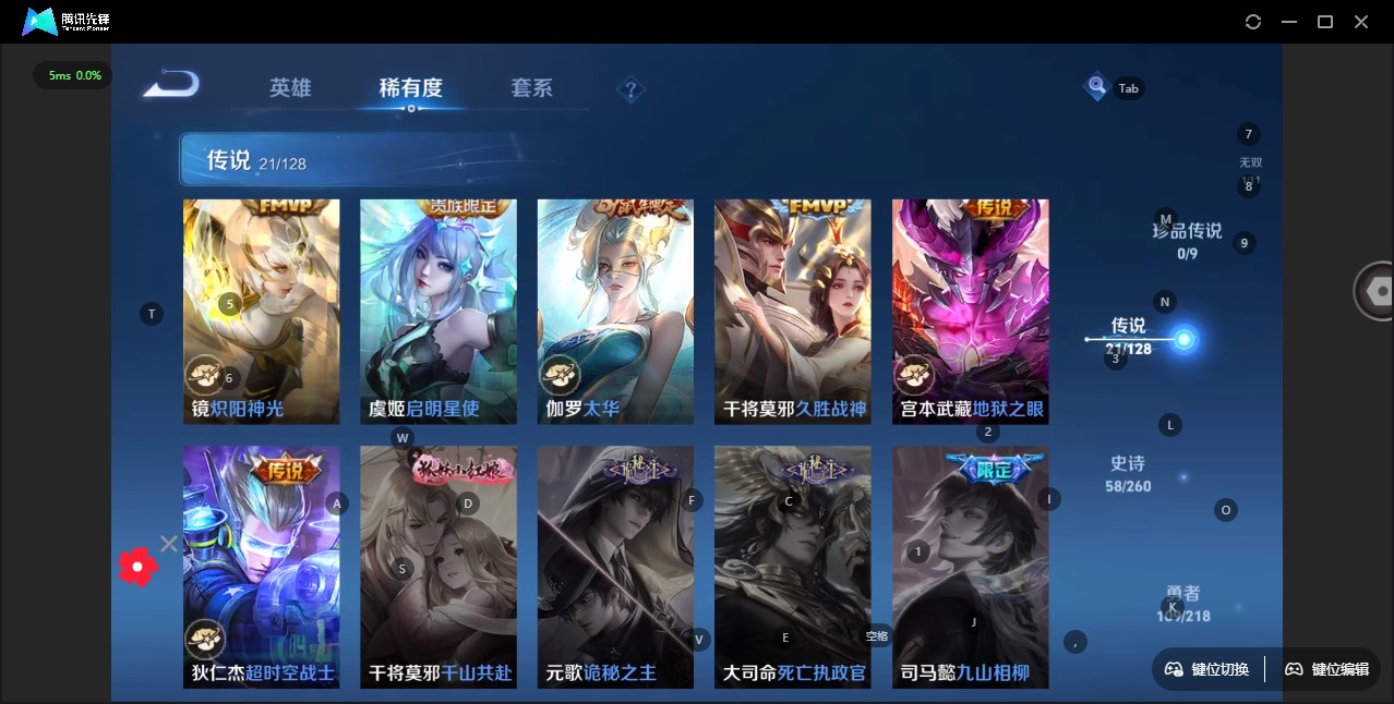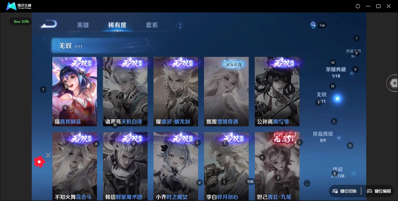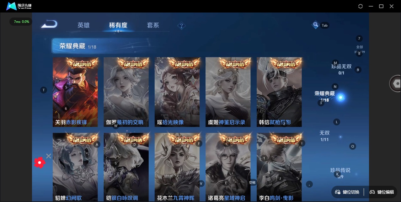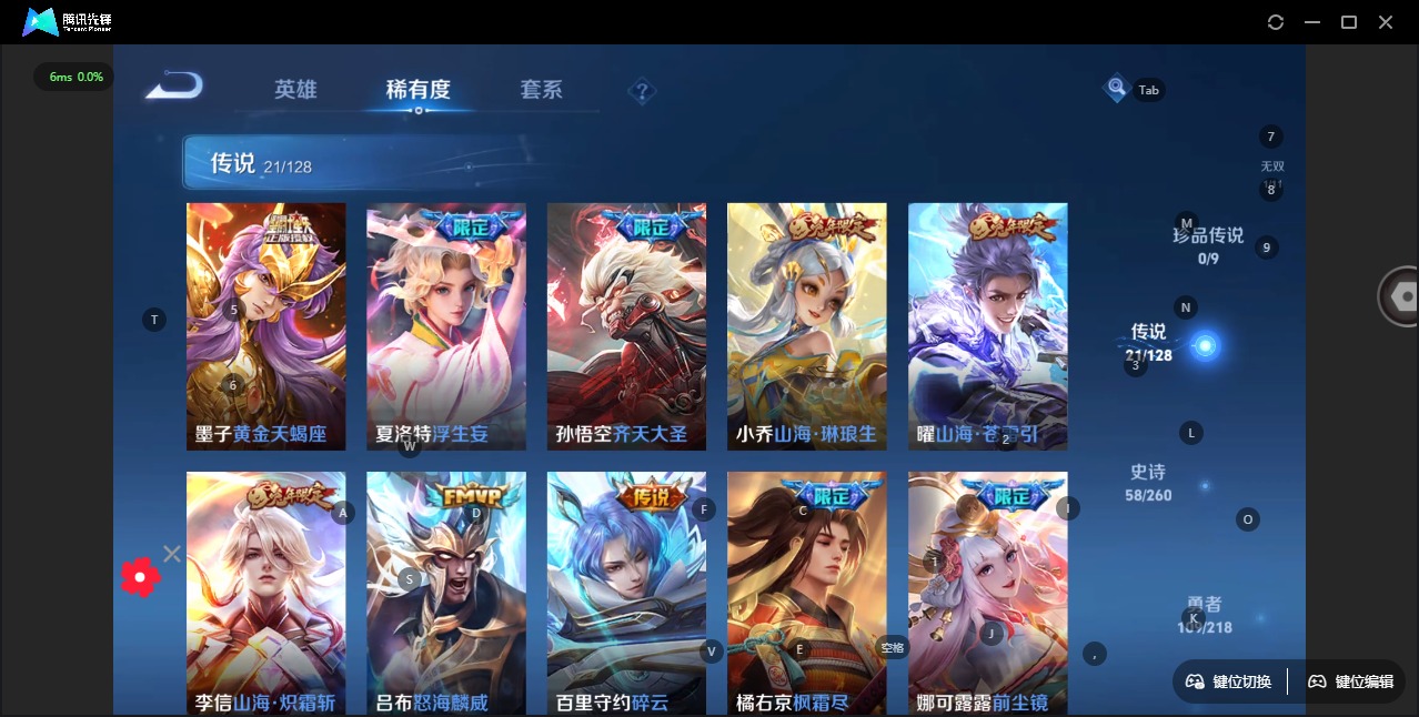 - PX_2086030-贵族等级: V8 英雄数: 123 皮肤数: 267 珍品传说: 器灵·落星盏 传说皮: 黄金白羊座,炽阳神光,一念神魔,地狱之眼,飞鸢探春,时之恋人-刘备,末日机甲-孙策,无双飞将,山海·苍雷引,浮生妄,妄想奇谈,霜月吟,澜逐花归海,幻光神枪,云诺千山 限定皮: 冰锋战神,李小龙,祈雪灵祝,梁祝,白晶晶,蜜橘之夏,逐梦之音,逐梦之光,美猴王,孙行者,匿光追影者,傲雪梅枪,寅