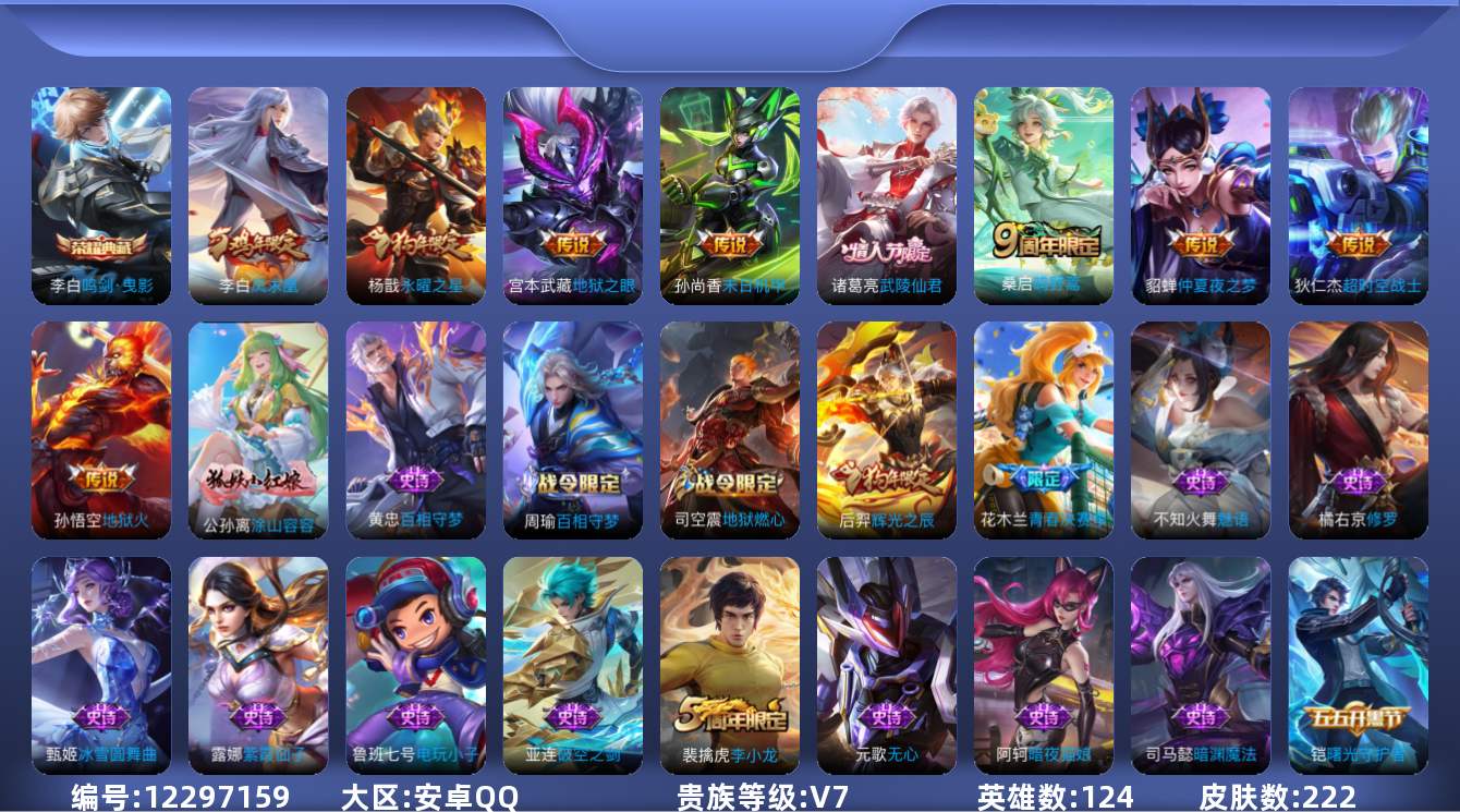 [12297159]V7 1典藏 9传说 124英雄 222皮肤 可修改实名 优质装备:鸣剑·曳影,末日机甲-孙尚香(绿蚂蚱),地狱火,仲夏夜之梦(大飞蛾),地狱之眼,超时空战士-狄仁杰,涂山容容 珍宝阁皮:女武神,玩趣恶龙 限定皮:鸣野蒿,凤求凰(白切鸡),武陵仙君(小桃花),高山流水,五谷丰年,游园惊梦,逐梦之星,李小龙,永曜之星,辉光之辰,霸王别姬-项羽,霸王别姬-虞姬,青春决赛季,云端筑梦师 史诗皮:星界战将,百相守梦-周瑜,破空之剑,蔬乡物语(鲁班七号),百相守梦-黄忠,紫霞仙子,苍穹之光,电玩小子(小书包),黄金分割率,特工魅影,千年之狐,江河有灵,魅语,百解令(蒙犽),高渐离燃音魔法,冰冠公主,青蛇,偶像歌手,暗夜猫娘,龙骑士(小龙虾),乱世虎臣,节奏热浪,修罗,女仆咖啡,水果甜心,星夜王子,心灵骇客,功夫厨神,德古拉伯爵,暗隐猎兽者,幽灵船长,鬼剑武藏,暗渊魔法,心灵战警,拒霜思,缤纷独角兽,乘风破浪,逐浪之夏,水晶猎龙者,曙光守护者,原初追逐者,圣诞狂欢,圣诞恋歌,鹰眼统帅,暗夜贵公子,魅力维加斯,黎明之约,无心