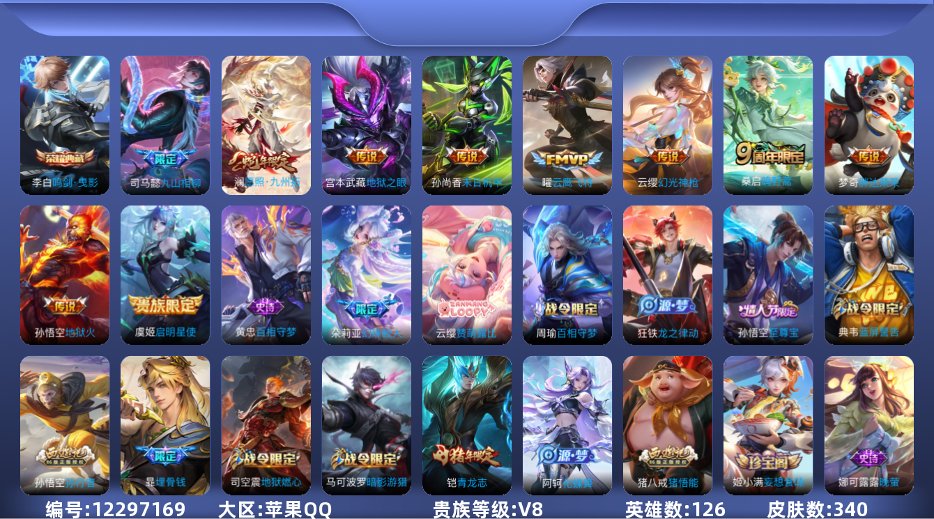[12297169]V8 1典藏 10传说 126英雄 340皮肤 典藏英雄武则天 可修改实名 优质装备:鸣剑·曳影,云鹰飞将(小将军),末日机甲-孙尚香(绿蚂蚱),地狱火,地狱之眼,胖达荣荣 传说皮:九山相柳,幻光神枪 珍宝阁皮:妄想食味,优雅恋人,蔷薇恋人 限定皮:愿照·九州拓(澜年限),逐霄战戟,鸣野蒿,至尊宝,遇见飞天,高山流水,五谷丰年,青龙志(铠年限),游园惊梦,梁祝,李小龙,孙行者,猪悟能 史诗皮:赞萌露比,器灵·浮梦炉,化蝶舞,星界战将,龙之律动,百相守梦-周瑜,幻珠鲛人,怒海争锋,破空之剑,战舞者,蒙犽顽岩魄,埋骨钱,百相守梦-百里守约,百相守梦-黄忠,紫霞仙子,电玩小子(小书包),白龙吟,黄金分割率,特工魅影,千年之狐,永昼,江河有灵,百解令(蒙犽),高渐离燃音魔法,蒙恬荣光圣徽,冰冠公主,偶像歌手,晚萤,电玩·爆裂旋风,暗夜猫娘,龙骑士(小龙虾),末日机甲-吕布,猫狗日记-孙策,乱世虎臣,节奏热浪,修罗,女仆咖啡,摇滚巨星,水果甜心,绅士熊喵,天才门将,星夜王子,心灵骇客,功夫厨神,德古拉伯爵,暗隐猎兽者,鬼剑武藏,乐园奇幻夜,舞动绿茵,地狱岩魂,纤云弄巧,繁星吟游(呼啦呼啦),拒霜思,缤纷独角兽,乘风破浪,逐浪之夏,水晶猎龙者,曙光守护者,金属风暴,原初追逐者,圣诞狂欢,圣诞恋歌,鹰眼统帅,王者之锤,暗夜贵公子,魅力维加斯,黎明之约,赏金猎手,无心,未来纪元-赵云