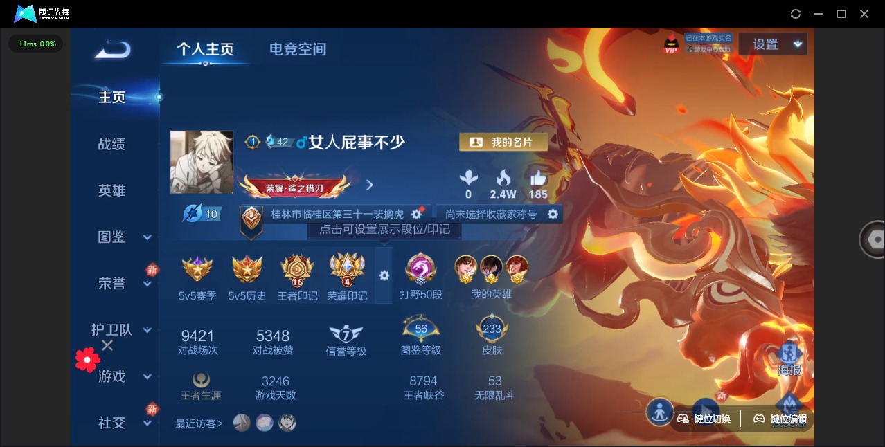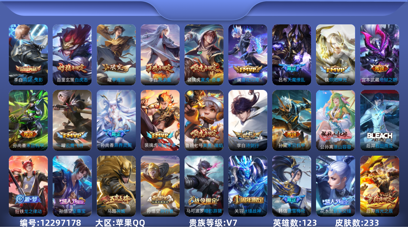 - [12229149]V10 2典藏 1珍品传说 23传说 126英雄 416皮肤 典藏英雄武则天 阿轲小国标 梦奇小国标 可修改实名 优质装备:赤影疾锋,弑枪猎影(韩信典藏),朽木白哉,绛天战甲(鸡嘴战神),炽阳神光,地狱火,仲夏夜之梦(大飞蛾),零号·赤焰,海洋之心,地狱之眼,胖达荣荣,时之恋人-刘备(电焊工),超时空战士-狄仁杰,挚爱之约,无双飞将,燃星之曲,鹤归松栖(云缨),霜月吟,艾琳觅芳踪,涂山容容 传说皮:九山相柳 珍宝阁皮:万物之道,优雅恋人 限定皮:愿照·九州拓(澜年限),鸣野蒿,至尊宝,白虎志(电光耗子),凤求凰(白切鸡),凤凰于飞,傲雪梅枪,白晶晶,飞衡(韩信年限),玄嵩(庄周年限),遇见飞天,高山流水,五谷丰年,冰锋战神,游园惊梦,梁祝,逐梦之星,烈魂,岱宗(典韦年限),李小龙,逐梦之光,如梦令-嫦娥,如梦令-后羿,霸王别姬-虞姬,奇迹圣诞,纯白花嫁,孙行者,大圣娶亲,引擎之心,冰霜恋舞曲,热情桑巴,美猴王,寅虎·赤拳(老虎年限),百木心枪,玉兔公主,山海·玄木吟(马可年限) 史诗皮:化蝶舞,灵蛊蚀心,星界战将,龙之律动,石田雨龙,百相守梦-周瑜,东方月初,超元猎域,百相守梦-黄忠,守夜人,紫霞仙子,电玩小子(小书包),白龙吟,黄金分割率,特工魅影,千年之狐,江河有灵,鹤归松栖(赵怀真),真我赫兹(镜),魅语,百解令(蒙犽),高渐离燃音魔法,蒙恬荣光圣徽,无限星赏官,冰冠公主,偶像歌手,白蛇,晚萤,电玩·爆裂旋风,暗夜猫娘,龙骑士(小龙虾),末日机甲-吕布,猫狗日记-孙策,猫狗日记-大乔,时之恋人-孙尚香,乱世虎臣,节奏热浪,修罗,女仆咖啡,摇滚巨星,水果甜心,绅士熊喵,天才门将,星夜王子,心灵骇客,时之奇旅-安琪拉,功夫厨神,德古拉伯爵,暗隐猎兽者,幽灵船长,鬼剑武藏,暗渊魔法,心灵战警,乐园奇幻夜,天秀·启明,舞动绿茵,地狱岩魂,诗语江南,纤云弄巧,拒霜思,缤纷独角兽,乘风破浪,逐浪之夏,月团寄思,水晶猎龙者,曙光守护者,热力回旋,箭羽风息,金属风暴,原初追逐者,圣诞狂欢,圣诞恋歌,鹰眼统帅,王者之锤,暗夜贵公子,魅力维加斯,黎明之约,雪上飞焰,千筹问战,无心,未来纪元-赵云