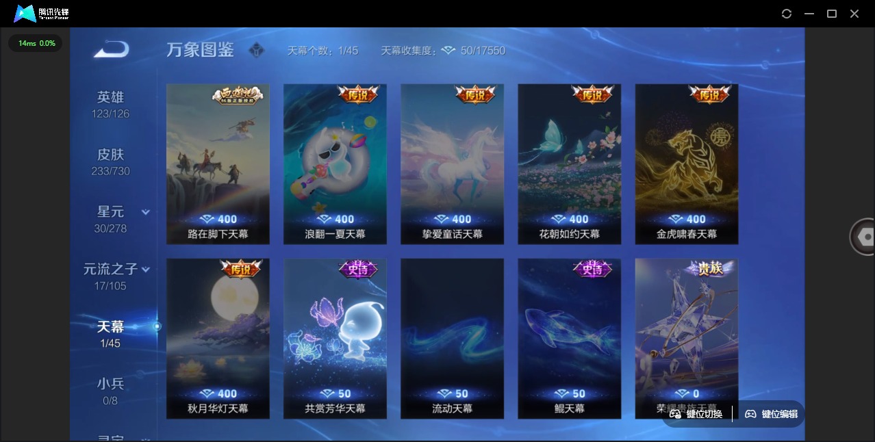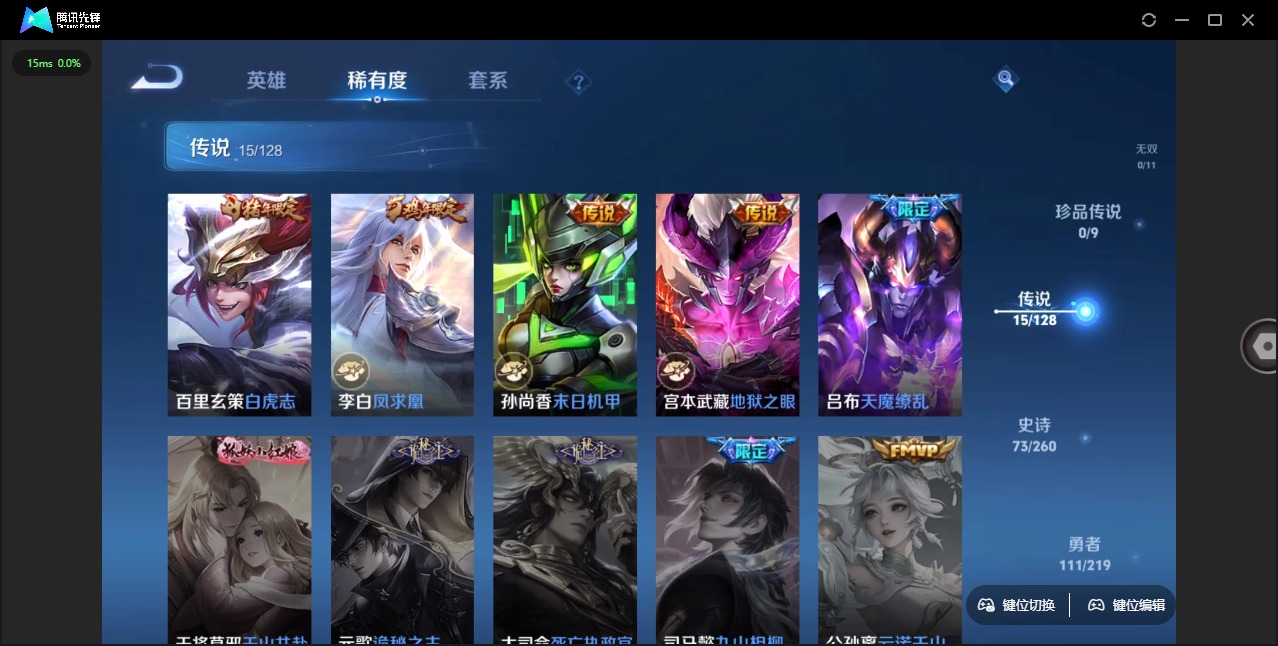 - PX_2081174-贵族等级: V4 英雄数: 121 皮肤数: 158 传说皮: 无双飞将,山海·炽霜斩,山海·苍雷引,幻光神枪 限定皮: 梁祝,引擎之心,飞衡,天狼狩猎者,孙行者,五谷丰年,诗剑行,山海·玄木吟,鸣野蒿,愿照·九州拓