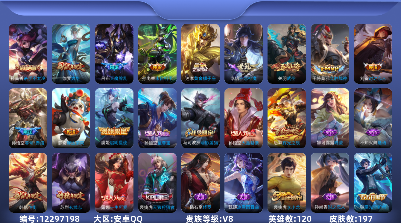 [12297198]V8 1典藏 11传说 120英雄 197皮肤 可修改实名 优质装备:杀手不太冷,黄金狮子座,久胜战神,一念神魔,末日机甲-孙尚香(绿蚂蚱),零号·赤焰,胖达荣荣,时之恋人-刘备(电焊工) 限定皮:至尊宝,太华(伽罗年限),飞衡(韩信年限),遇见飞天,五谷丰年,武圣,游园惊梦,梁祝,天狼狩猎者,李小龙,逐梦之光,玄武志(苏烈年限),辉光之辰,一生所爱,大圣娶亲,天魔缭乱 史诗皮:白龙吟,黄金分割率,千年之狐,魅语,无限星赏官,冰冠公主,偶像歌手,晚萤,猫狗日记-孙策,时之恋人-孙尚香,修罗,水果甜心,天才门将,星夜王子,功夫厨神,德古拉伯爵,暗隐猎兽者,幽灵船长,鬼剑武藏,舞动绿茵,地狱岩魂,繁星吟游(呼啦呼啦),缤纷独角兽,乘风破浪,水晶猎龙者,曙光守护者,箭羽风息,金属风暴,原初追逐者,鹰眼统帅,暗夜贵公子,魅力维加斯,未来纪元-赵云