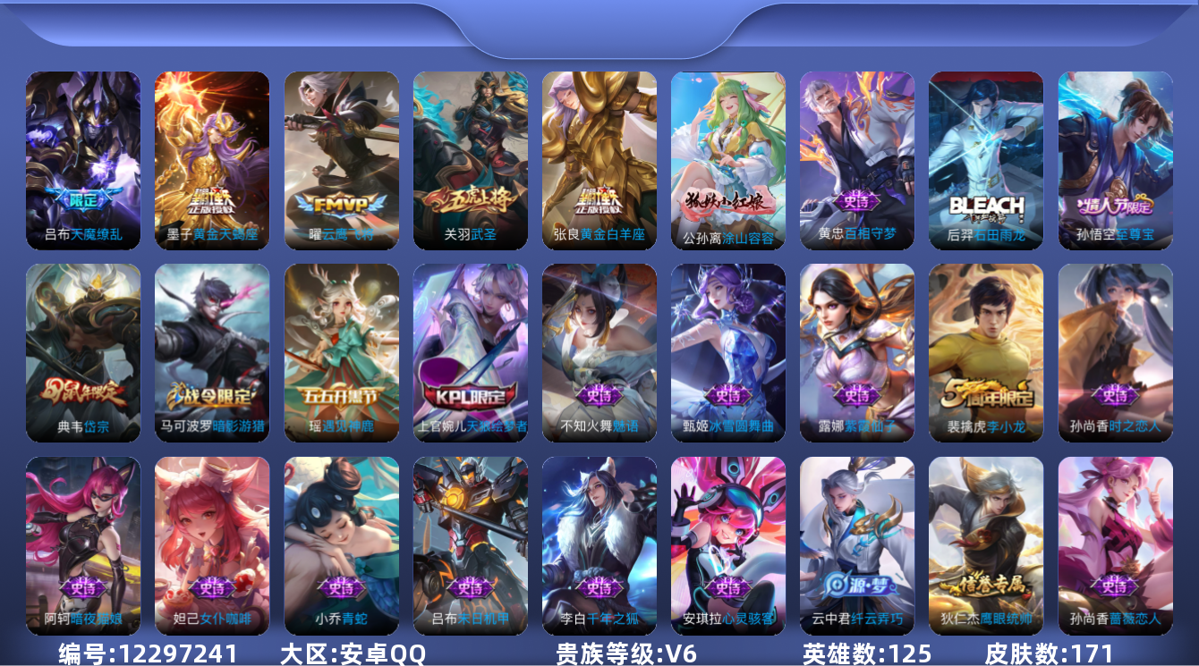 - [12090047]V7 1典藏 7传说 125英雄 243皮肤 可修改实名 优质装备:全息碎影(猴子典藏),地狱之眼,胖达荣荣,澜逐花归海,黄金天蝎座 传说皮:乘龙·问璇玑(孙尚香年限),吕布曦玄引 珍宝阁皮:蔷薇恋人 限定皮:鸣野蒿,白晶晶,飞衡(韩信年限),五谷丰年,李小龙,如梦令-后羿,美猴王,时之奇旅-妲己 史诗皮:鸭鸭历险记-刘禅,化蝶舞,龙之律动,破空之剑,琥珀纪元伽罗,蔬乡物语(鲁班七号),乘龙·聚宝船(安琪拉年限),百相守梦-黄忠,遇见神鹿,紫霞仙子,苍穹之光,黄金分割率,特工魅影,千年之狐,江河有灵,百解令(蒙犽),高渐离燃音魔法,蒙恬荣光圣徽,冰冠公主,青蛇,偶像歌手,电玩·爆裂旋风,末日机甲-吕布,猫狗日记-大乔,节奏热浪,修罗,摇滚巨星,水果甜心,心灵骇客,功夫厨神,德古拉伯爵,暗隐猎兽者,幽灵船长,鬼剑武藏,暗渊魔法,纤云弄巧,拒霜思,缤纷独角兽,乘风破浪,逐浪之夏,曙光守护者,金属风暴,原初追逐者,圣诞狂欢,圣诞恋歌,鹰眼统帅,暗夜贵公子,魅力维加斯,无心,未来纪元-赵云