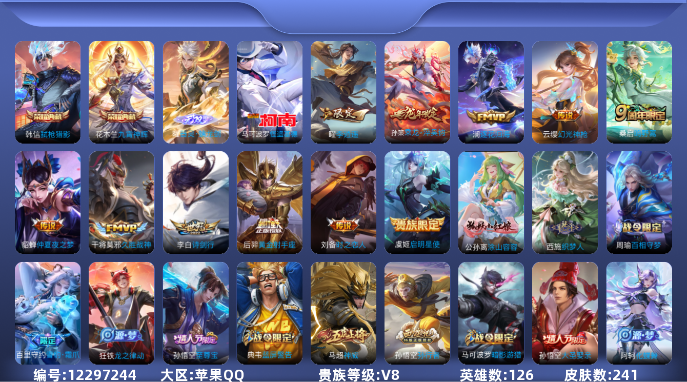 [12297244]V8 2典藏 1无双 1珍品传说 11传说 126英雄 241皮肤 可修改实名 优质装备:九霄神辉(木兰典藏),弑枪猎影(韩信典藏),器灵·螭龙剑,怪盗基德,黄金射手座,久胜战神,仲夏夜之梦(大飞蛾),李逍遥,时之恋人-刘备(电焊工),澜逐花归海,涂山容容 传说皮:乘龙·淬吴钩(孙策年限),幻光神枪 珍宝阁皮:优雅恋人,蔷薇恋人,女武神 限定皮:鸣野蒿,至尊宝,凤凰于飞,神威(电光马子),遇见飞天,诗剑行,李小龙,孙行者,大圣娶亲,百木心枪 史诗皮:化蝶舞,雪豹·霜爪,龙之律动,茶境仙,百相守梦-周瑜,蒙犽顽岩魄,谪仙醉月,破空之剑,蔬乡物语(鲁班七号),星界战将,织梦人,苍穹之光,电玩小子(小书包),白龙吟,黄金分割率,特工魅影,江河有灵,龙骑士(小龙虾),百解令(蒙犽),高渐离燃音魔法,魅语,冰冠公主,偶像歌手,末日机甲-吕布,猫狗日记-孙策,乱世虎臣,修罗,女仆咖啡,摇滚巨星,水果甜心,绅士熊喵,星夜王子,心灵骇客,功夫厨神,德古拉伯爵,暗隐猎兽者,幽灵船长,鬼剑武藏,舞动绿茵,地狱岩魂,诗语江南,纤云弄巧,拒霜思,缤纷独角兽,逐浪之夏,月团寄思,水晶猎龙者,曙光守护者,箭羽风息,金属风暴,鹰眼统帅,暗夜贵公子,魅力维加斯,赏金猎手,未来纪元-赵云