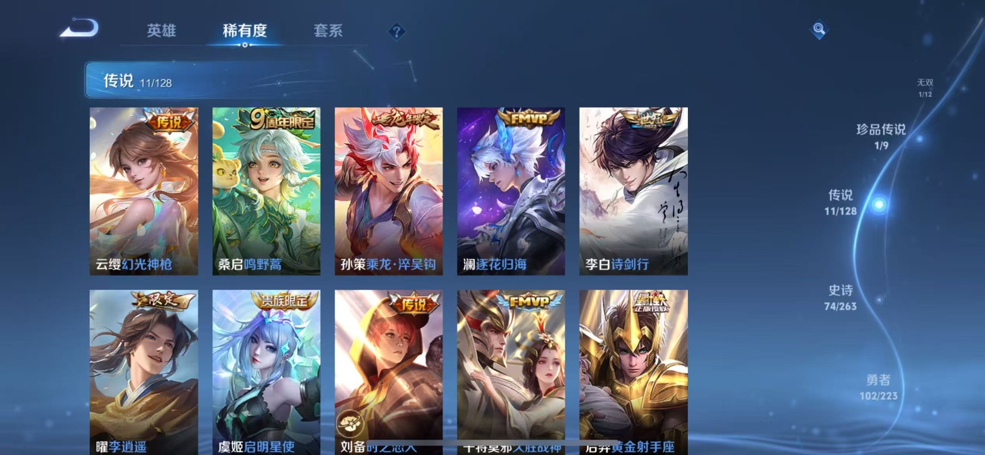 - [11840646]V7 1典藏 14传说 124英雄 174皮肤 可修改实名 优质装备:赤影疾锋,黄金狮子座,冠军飞将,绛天战甲(鸡嘴战神),一念神魔,碎云,遇见神鼓 传说皮:乘龙·淬吴钩(孙策年限),典韦战鼓燎原,铠冥王哈迪斯,祥瑞亨通 珍宝阁皮:玩趣恶龙 限定皮:愿照·山河定(司空震年限),遇见飞天,诗剑行,怒海麟威,五谷丰年,青龙志(铠年限),武圣,李小龙,孙行者 史诗皮:器灵·浮梦炉,星界战将,石田雨龙,怒海争锋,埋骨钱,百相守梦-黄忠,苍穹之光,电玩小子(小书包),白龙吟,特工魅影,千年之狐,江河有灵,蒙恬荣光圣徽,偶像歌手,龙骑士(小龙虾),末日机甲-吕布,猫狗日记-孙策,乱世虎臣,节奏热浪,修罗,摇滚巨星,水果甜心,绅士熊喵,星夜王子,心灵骇客,德古拉伯爵,暗隐猎兽者,幽灵船长,鬼剑武藏,暗渊魔法,心灵战警,拒霜思,乘风破浪,逐浪之夏,水晶猎龙者,曙光守护者,金属风暴,圣诞狂欢,鹰眼统帅,魅力维加斯,赏金猎手,无心,未来纪元-赵云