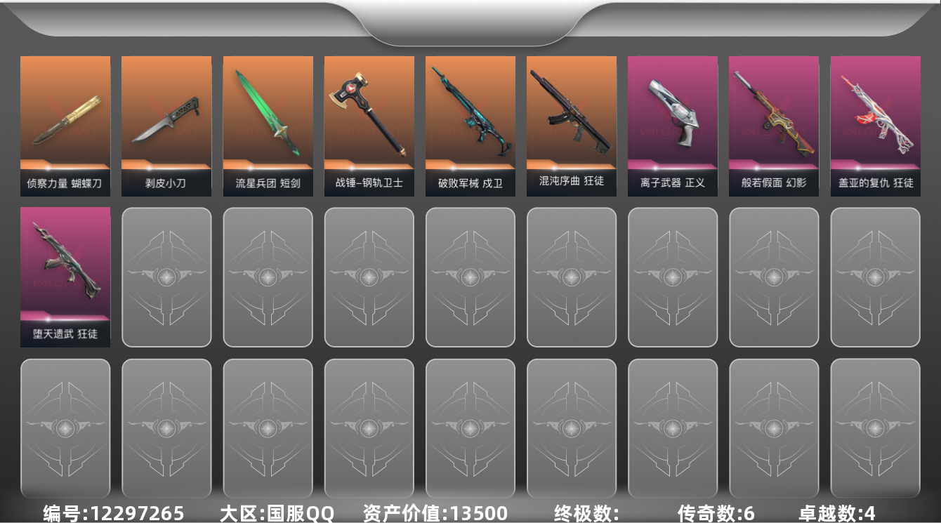 [12297265]6橙皮 4紫皮 40皮肤 27英雄 90卡面 545已用源晶 黄金 优质装备:狂徒-混沌序曲,狂徒-盖亚的复仇,幻影-般若假面,正义-离子武器,蝴蝶刀-侦察力量,剥皮小刀,戍卫-破败军械 步枪皮肤:狂徒-堕天遗武 近战武器皮肤:战锤-钢轨卫士,短剑-流星兵团