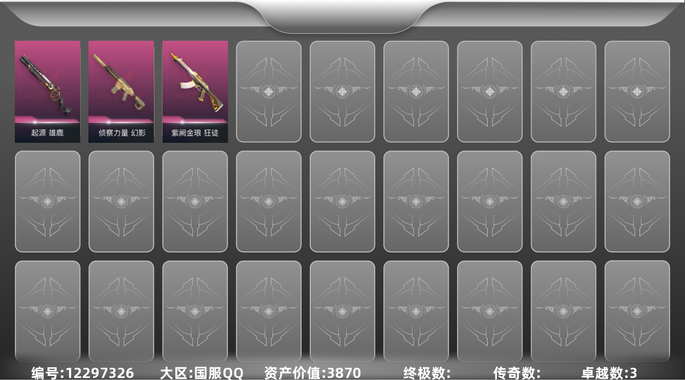 [12297326]3紫皮 3皮肤 10英雄 18卡面 150已用源晶 青铜 优质装备:狂徒-紫阙金琅,幻影-侦察力量,雄鹿-起源