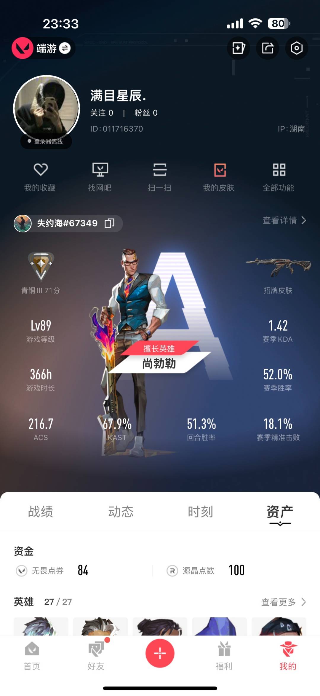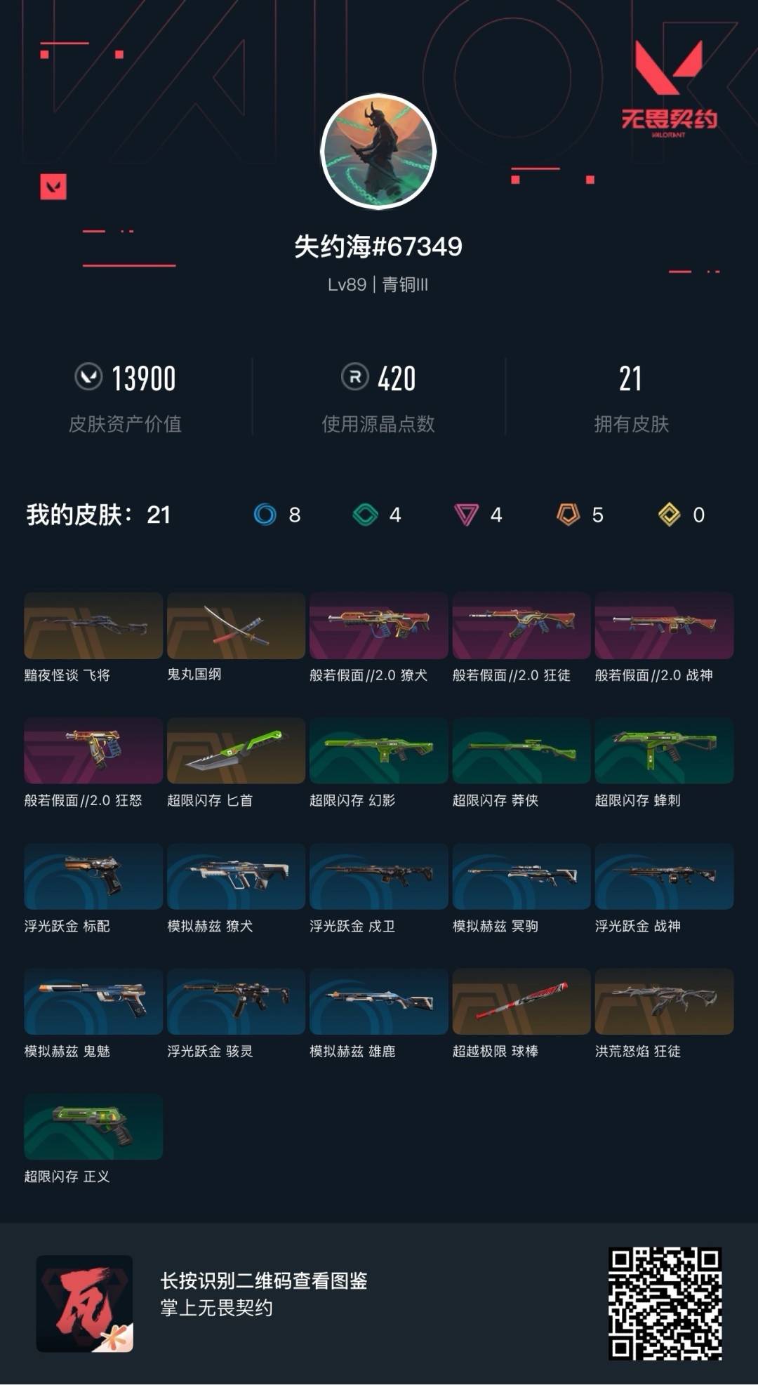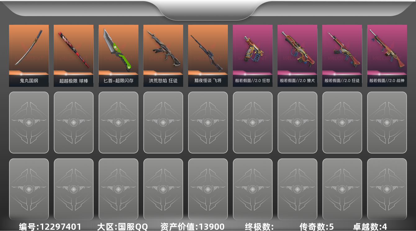 [12297401]5橙皮 4紫皮 21皮肤 27英雄 55卡面 420已用源晶 青铜 优质装备:狂徒-洪荒怒焰,球棒-超越极限,匕首-超限闪存,鬼丸国纲 套装:般若假面//2.0套装 佩枪皮肤:狂怒-般若假面//2.0 步枪皮肤:狂徒-般若假面//2.0,獠犬-般若假面//2.0 狙击枪皮肤:飞将-黯夜怪谈 机枪皮肤:战神-般若假面//2.0