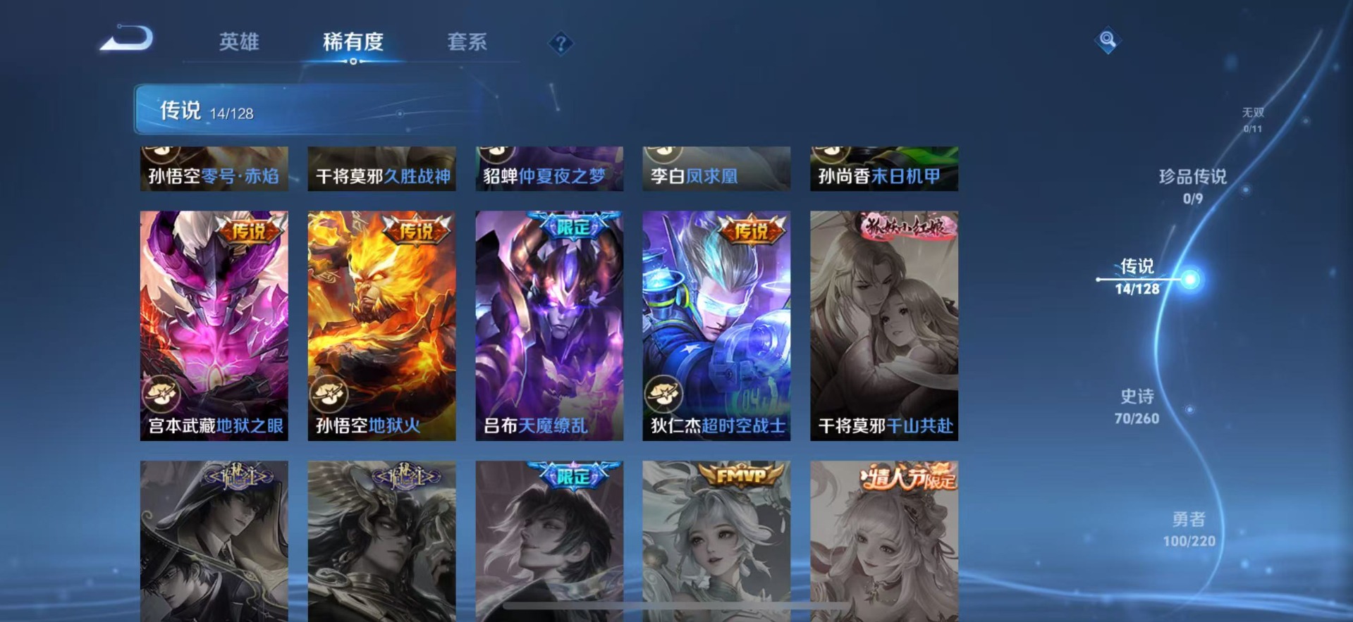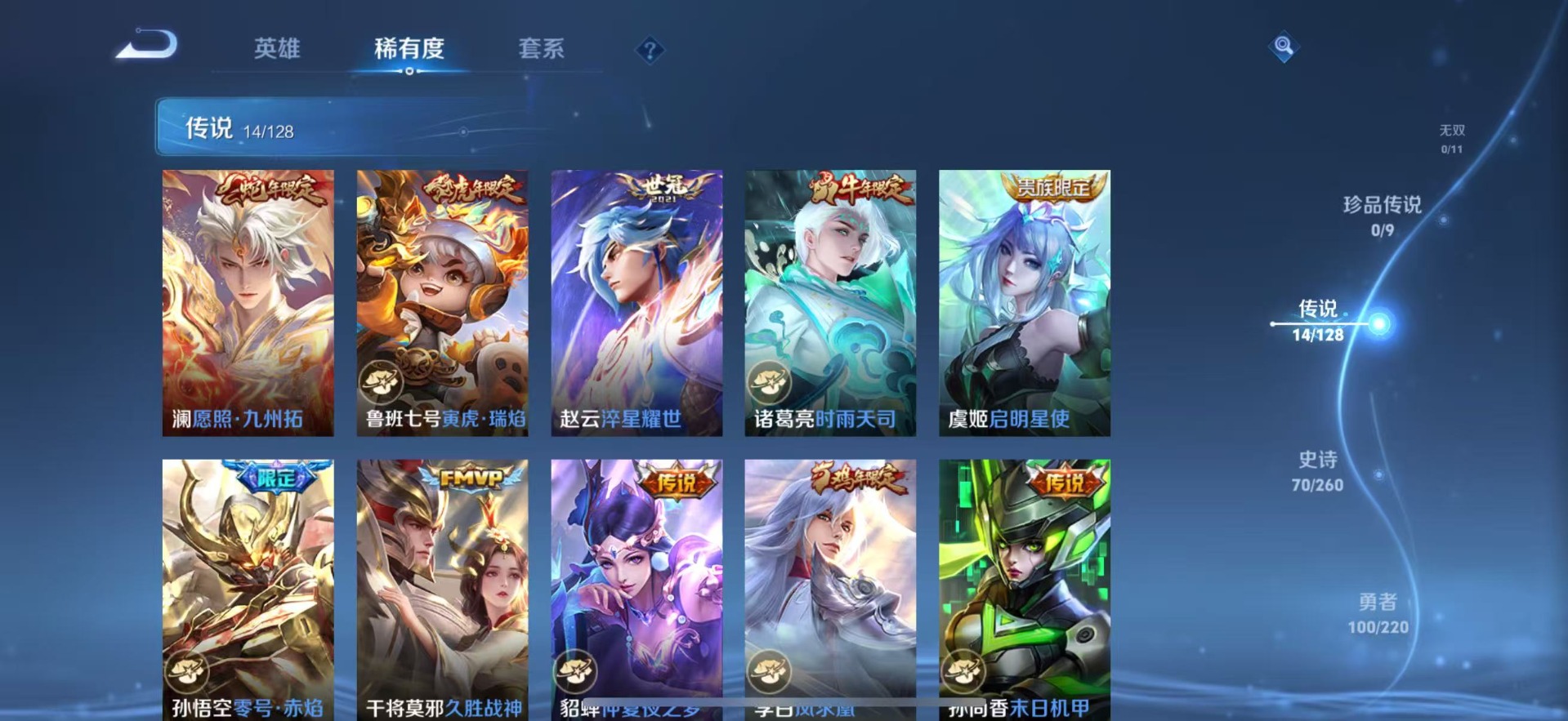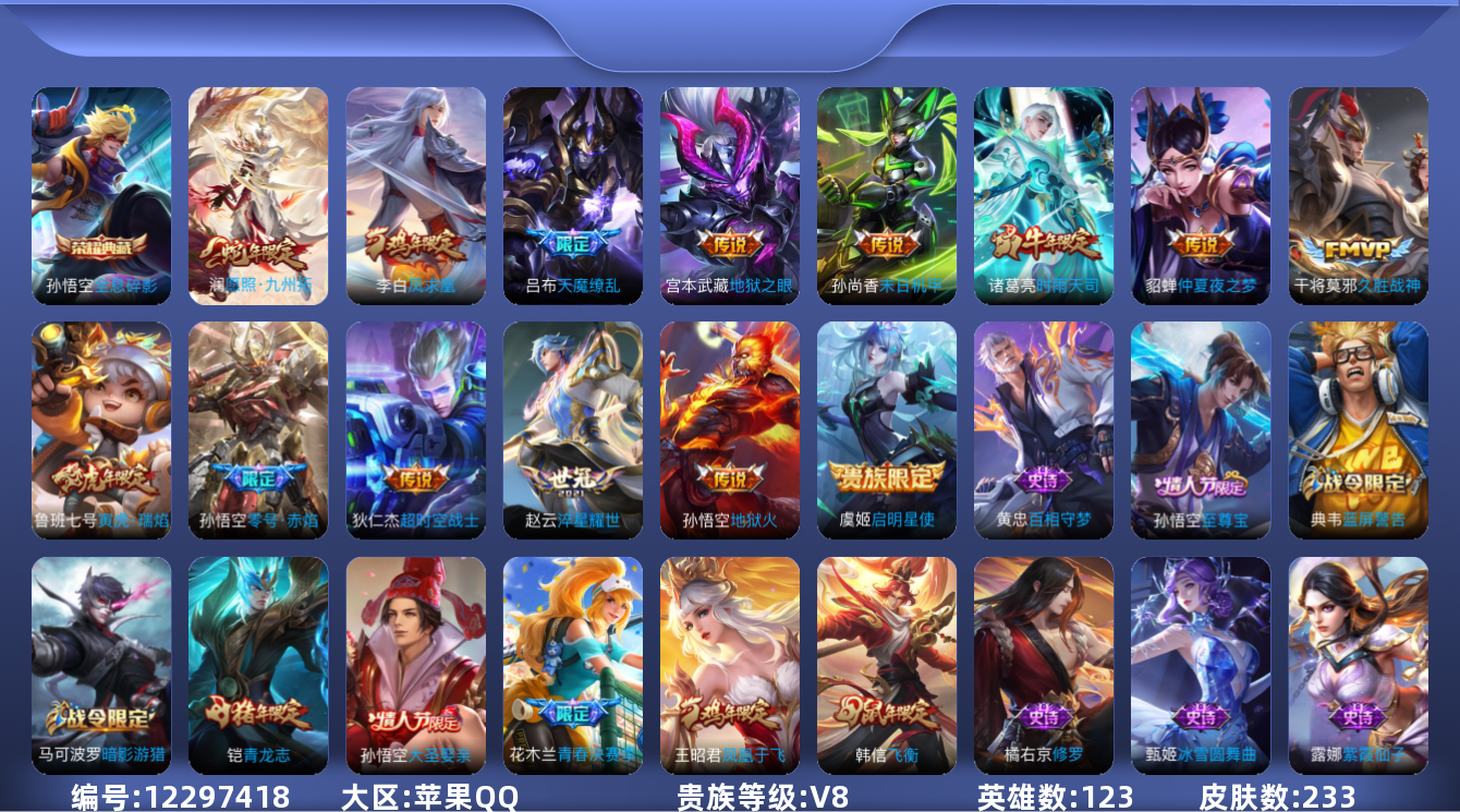 - [11296780]V9 3典藏 16传说 126英雄 325皮肤 典藏英雄武则天 可修改实名 荣耀水晶:神鉴启示录,全息碎影(猴子典藏),无限飓风号(高达) 传说皮:李逍遥,黄金射手座,仲夏夜之梦(大飞蛾),海洋之心,地狱之眼,一念神魔,淬星耀世,云鹰飞将(小将军),音你心动-周瑜,超时空战士-狄仁杰,音你闪耀(rap皮) 珍宝阁皮:优雅恋人,蔷薇恋人 限定皮:鸣野蒿,至尊宝,凤凰于飞,异界灵契(白毛香),白晶晶,时雨天司(水龙头),神威(电光马子),高山流水,五谷丰年,冰锋战神,天狼运算者,梁祝,御风骁将(吕布年限),天狼狩猎者,逐梦之星,天狼溯光者,奔雷神使(牛魔年限),李小龙,逐梦之光,朱雀志(守约年限),辉光之辰,霸王别姬-项羽,霸王别姬-虞姬,默契交锋-花木兰,冰霜恋舞曲,乒乒小将,蜜橘之夏,玉兔公主,深海之息(深海大菠萝),山海·玄木吟(马可年限) 史诗皮:星界战将,破空之剑,遇见神鹿,紫霞仙子,苍穹之光,电玩小子(小书包),白龙吟,黄金分割率,特工魅影,千年之狐,永昼,百解令(蒙犽),蒙恬荣光圣徽,冰冠公主,青蛇,偶像歌手,晚萤,魅语,暗夜猫娘,龙骑士(小龙虾),末日机甲-吕布,猫狗日记-孙策,猫狗日记-大乔,时之恋人-孙尚香,乱世虎臣,节奏热浪,修罗,女仆咖啡,摇滚巨星,水果甜心,绅士熊喵,天才门将,星夜王子,心灵骇客,功夫厨神,德古拉伯爵,暗隐猎兽者,幽灵船长,鬼剑武藏,心灵战警,舞动绿茵,地狱岩魂,纤云弄巧,繁星吟游(呼啦呼啦),拒霜思,缤纷独角兽,乘风破浪,逐浪之夏,水晶猎龙者,曙光守护者,箭羽风息,金属风暴,原初追逐者,圣诞狂欢,圣诞恋歌,鹰眼统帅,暗夜贵公子,魅力维加斯,黎明之约,赏金猎手,无心,未来纪元-赵云