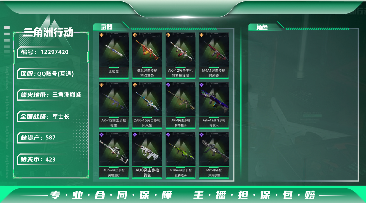 [12297420]总资产:587.8M 1近战传说 6传说枪械 哈夫币:423K 高级安全箱(9.17到期) 可二次 可修改实名 优质装备:近战-北极星 烽火地带段位:三角洲巅峰 全面战场段位:军士长 传说武器皮肤:AK-12突击步枪-夜鹰,腾龙突击步枪-捞点薯条,AK-12突击步枪-特斯拉线圈,CAR-15突击步枪-阿米娅,M4A1突击步枪-阿米娅 史诗武器皮肤:AUG突击步枪-蝮蛇,Ash-12战斗步枪-守夜人,M16A4突击步枪-竞赛选手,AS Val突击步枪-尖端治疗,SG552突击步枪-尖端治疗,MP5冲锋枪-深海恐惧,AKM突击步枪-林中猎手,腾龙突击步枪-无垢