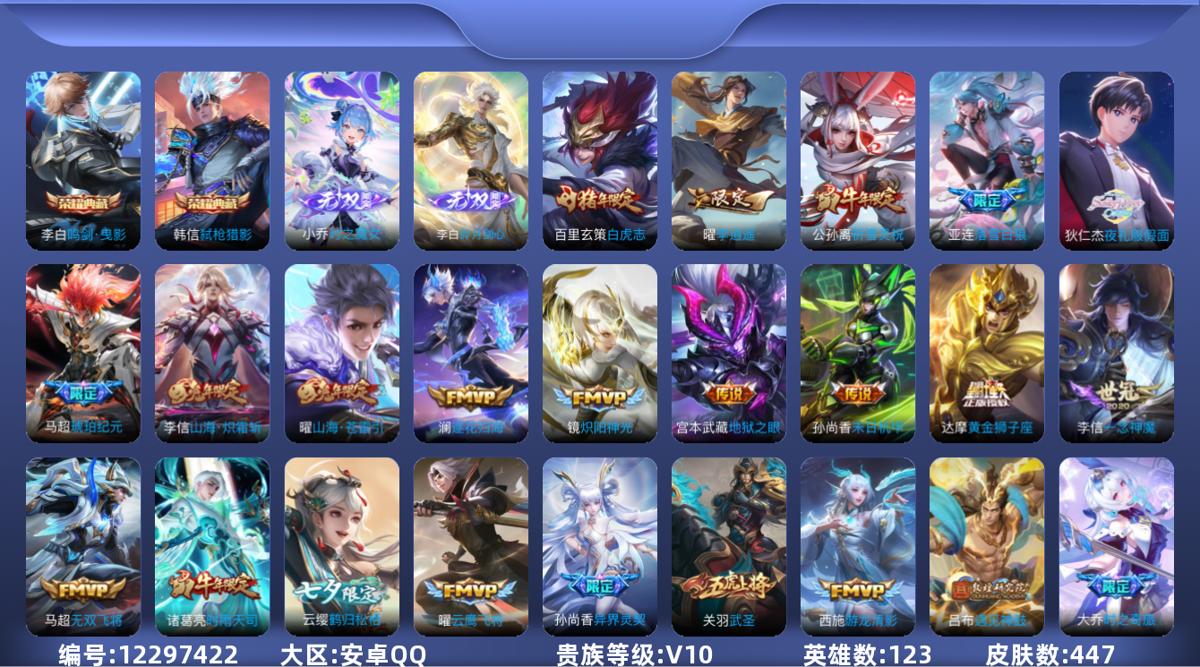 [12297422]V10 2典藏 2无双 51传说 123英雄 447皮肤 可修改实名 优质装备:鸣剑·曳影,弑枪猎影(韩信典藏),碎月剑心(李白无双),小乔时之魔女(小乔无双),黄金狮子座,黄金射手座,云鹰飞将(小将军),黄金白羊座,炽阳神光,一念神魔,云霓雀翎,末日机甲-孙尚香(绿蚂蚱),零号·赤焰,地狱之眼,音你心动-周瑜,李逍遥,乞巧织情,时之恋人-刘备(电焊工),游龙清影(小青龙),淬星耀世,超时空战士-狄仁杰,末日机甲-孙策,无双飞将,山海·炽霜斩(李信年限),山海·苍雷引(电光曜子),记忆之芯(机甲兔),百相守梦(张飞),鹤羽星尊,灼幽烈阳,妄想实况,妄想奇谈,鹤归松栖(云缨),遇见神鼓,鲁班七号-时之奇旅,大乔-时之奇旅,永恒水手月亮,夜礼服假面,澜逐花归海,艾琳觅芳踪,琥珀纪元铠,琥珀纪元马超,金乌负日 传说皮:落雪白狼 珍宝阁皮:优雅恋人,玩趣恶龙 限定皮:鸣野蒿,至尊宝,白虎志(电光耗子),异界灵契(白毛香),傲雪梅枪,白晶晶,时雨天司(水龙头),神威(电光马子),无限倾心-项羽,瑞麟志(木兰年限),至美·乘鲤谣,影龙天霄,无限倾心-虞姬,匿光决锋者,五谷丰年,青龙志(铠年限),冰锋战神,幽恒(沐浴露),武圣,天狼运算者,游园惊梦,御风骁将(吕布年限),天狼狩猎者,龙胆,烈魂,岱宗(典韦年限),天狼溯光者,虎魄,奔雷神使(牛魔年限),祈雪灵祝(雪兔子),天狼绘梦者,李小龙,逐梦之影,逐梦之光,玄武志(苏烈年限),朱雀志(守约年限),辉光之辰,如梦令-后羿,霸王别姬-项羽,圣诞老人,奇迹圣诞,孙行者,一生所爱,引擎之心,青春决赛季,冰霜恋舞曲,云端筑梦师,蜜橘之夏,美猴王,匿光追影者,女儿国国王,时之祈愿-云中君,百木心枪,玉兔公主,启示之音,枫霜尽,匿光启智者,时之奇旅-妲己,神器·万象笔,山海·玄木吟(马可年限) 史诗皮:星界战将,怒海争锋,炽弈燎原,东方月初,埋骨钱,琥珀纪元伽罗,奇遇星旅,蔬乡物语(鲁班七号),遇见神鹿,紫霞仙子,苍穹之光,电玩小子(小书包),白龙吟,黄金分割率,特工魅影,千年之狐,永昼,江河有灵,匿光侦查者,末日机甲-莱西奥,鹤归松栖(赵怀真),雪夜绮愿(周瑜),真我赫兹(镜),真我赫兹(百里守约),完美假期,魅语,百解令(蒙犽),高渐离燃音魔法,蒙恬荣光圣徽,无限星赏官,匿光破解者,冰冠公主,青蛇,偶像歌手,白蛇,晚萤,电玩·爆裂旋