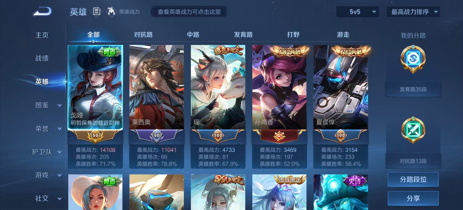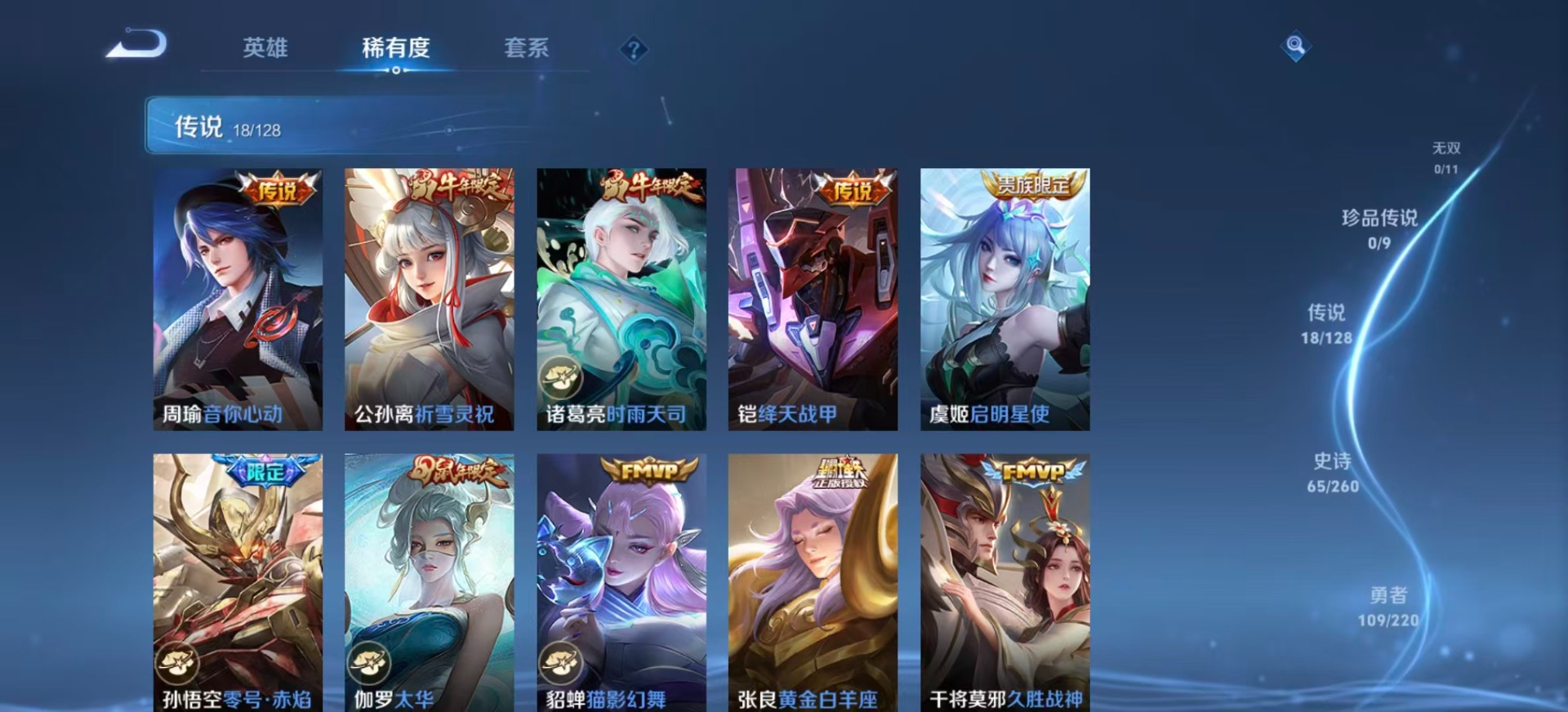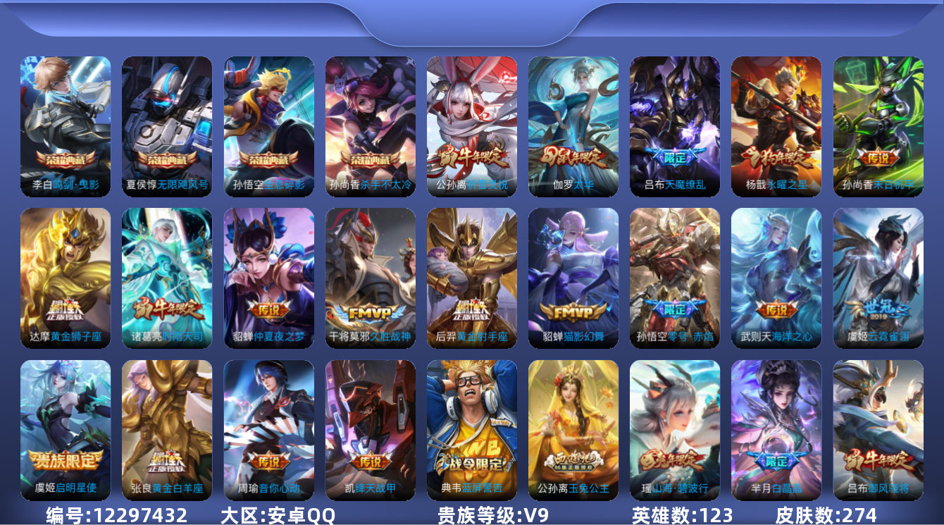 - [11689106]V7 12传说 123英雄 205皮肤 可修改实名 女号 优质装备:一念神魔,音你心动-周瑜,时之恋人-刘备(电焊工),超时空战士-狄仁杰,无双飞将,山海·炽霜斩(李信年限),山海·苍雷引(电光曜子),浮生妄,琥珀纪元铠 珍宝阁皮:妄想食味 限定皮:逐霄战戟,鸣野蒿,至尊宝,傲雪梅枪,无限倾心-项羽,齐天大圣,五谷丰年,岱宗(典韦年限),李小龙,孙行者,时之奇旅-妲己,梦圆繁星,山海·玄木吟(马可年限) 史诗皮:器灵·浮梦炉,谪仙醉月,破空之剑,战舞者,东方月初,琥珀纪元伽罗,紫霞仙子,特工魅影,永昼,江河有灵,匿光侦查者,百解令(蒙犽),高渐离燃音魔法,偶像歌手,电玩·爆裂旋风,百相守梦(刘备),暗夜猫娘,百相守梦(关羽),末日机甲-吕布,猫狗日记-孙策,节奏热浪,修罗,水果甜心,天才门将,心灵骇客,暗隐猎兽者,幽灵船长,鬼剑武藏,暗渊魔法,心灵战警,地狱岩魂,诗语江南,纤云弄巧,拒霜思,缤纷独角兽,乘风破浪,水晶猎龙者,曙光守护者,金属风暴,圣诞狂欢,鹰眼统帅,魅力维加斯,无心,未来纪元-赵云,玫瑰异探