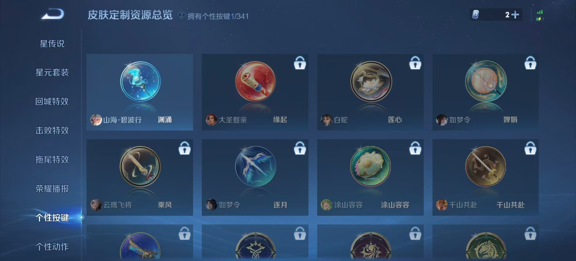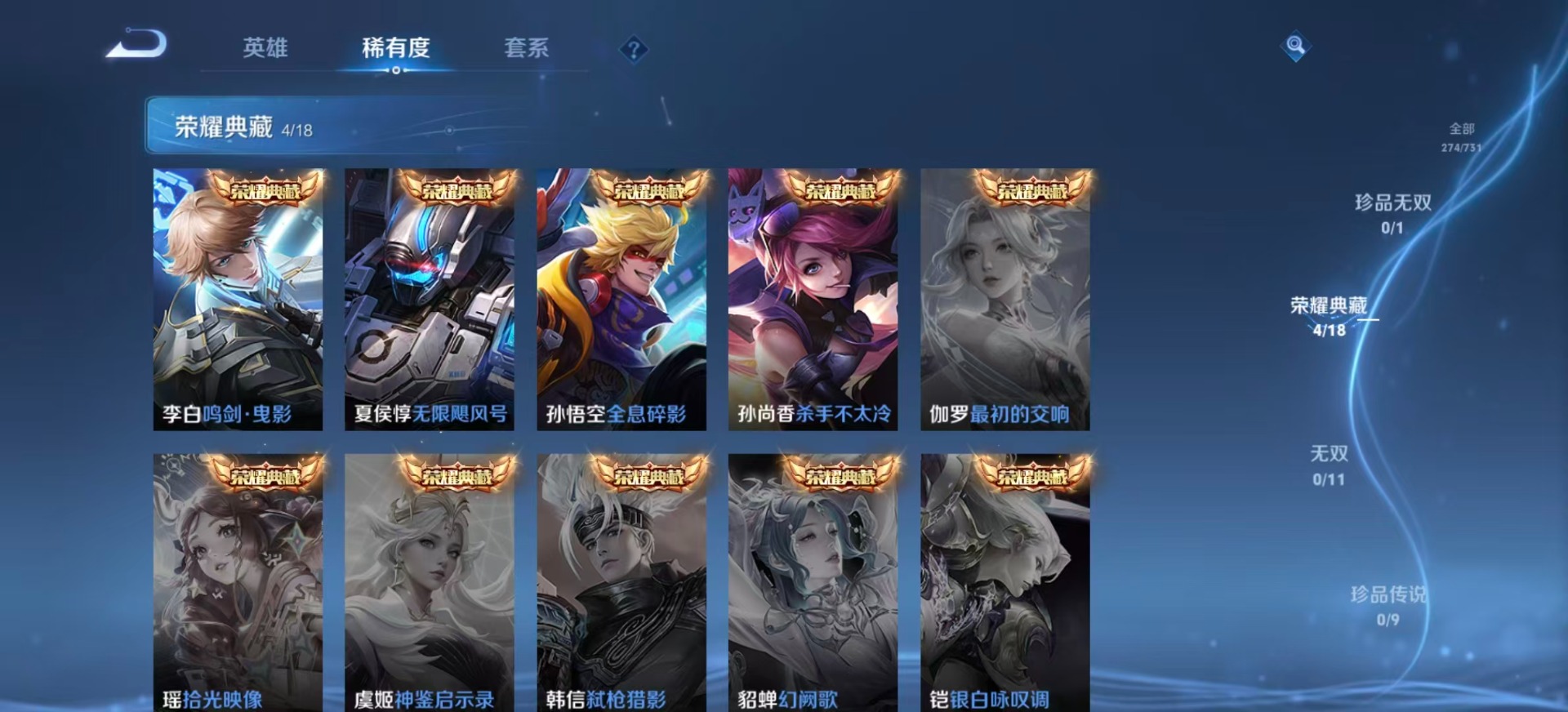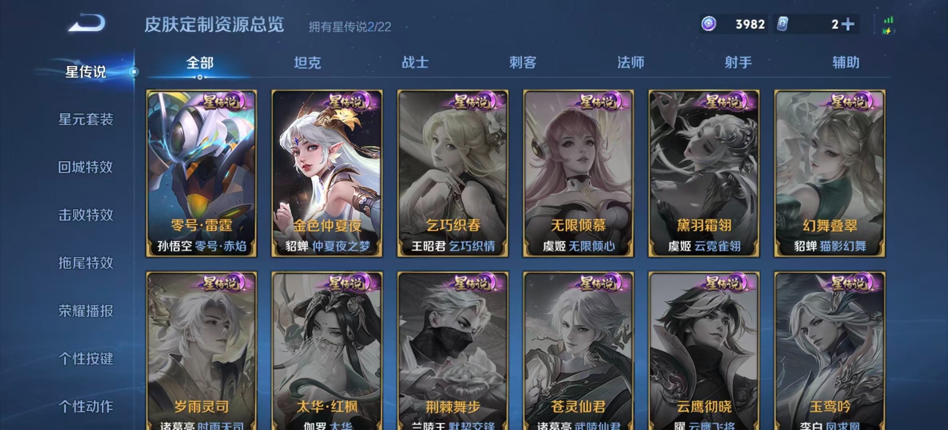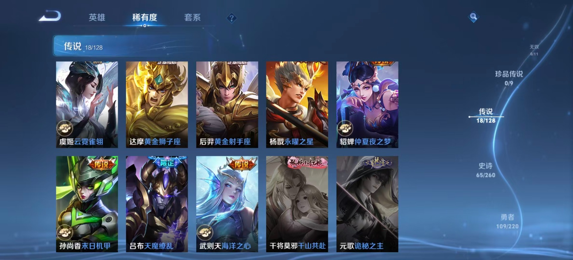 刘邦夺宝奇兵,夏侯惇朔风刀,老夫子醍醐杖,沈梦溪星空之诺,沈梦溪大漠名商,盾山御銮,曹操烛龙,孙膑妖精王,苏烈千军破阵,典韦穷奇,典韦蓝屏警告,达摩沙漠行僧,牛魔御旌,鲁班七号狮舞东方,吕布猎兽之王,庄周蜃楼王,兰陵王金庭之子,裴擒虎擒涛扼浪,鲁班大师探海日志,明世隐疑决卦,白起狰,亚瑟狮心王,鬼谷子原初探秘者,张良古海寻踪,女娲朔望之晖,桑启海盐诗旅,狄仁杰万华元夜,嬴政白昼王子,芈月重明,程咬金演武夺筹,扁鹊炼金王,李元芳银河之约,李元芳云中旅人,弈星混沌棋,虞姬凯尔特女王,米莱狄御霄,钟馗神迹守卫,钟馗驱傩正仪,狂铁御狮,太乙真人饕餮