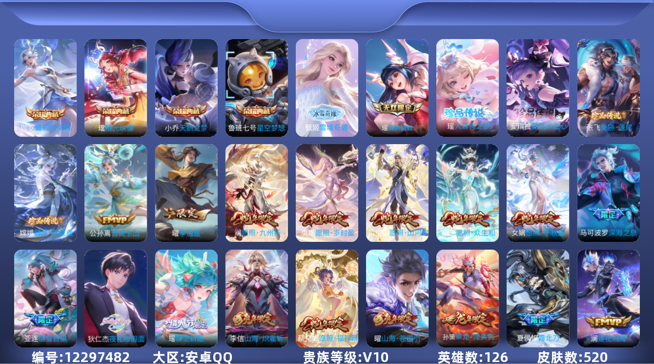 [12297482]V10 4典藏 2无双 4珍品传说 67传说 126英雄 520皮肤 典藏英雄武则天 可修改实名 优质装备:天鹅之梦(小乔典藏),星空梦想(太空人),真我赫兹(瑶)(瑶无双),拾光映像(瑶典藏),雪境奇遇-甄姬,最初的交响(伽罗典藏),器灵·落星盏,酷洛米之心,大耳狗之梦,绛天战甲(鸡嘴战神),黄金白羊座,猫影幻舞,炽阳神光,一念神魔,云霓雀翎,仲夏夜之梦(大飞蛾),海洋之心,胖达荣荣,李逍遥,乞巧织情,游龙清影(小青龙),淬星耀世,花朝如约(花篮子),挚爱之约,挚爱花嫁,碎云,神器·狴犴令,山海·炽霜斩(李信年限),山海·琳琅生(小乔年限),山海·苍雷引(电光曜子),炽翼辉光(娃娃菜牛角包),燃星之曲,画中仙,浮生妄,妄想奇谈,大乔-时之奇旅,永恒水手月亮,夜礼服假面,澜逐花归海,艾琳觅芳踪,金乌负日,朵莉亚心动手记 珍品传说:兔狲·蓬尾 传说皮:乘龙·问璇玑(孙尚香年限),乘龙·铭钟鼎(赵云年限),乘龙·淬吴钩(孙策年限),貂蝉曦玄引,吕布曦玄引,落雪白狼,云诺千山,续相思,星之鸣奏,祥瑞亨通,幻光神枪 珍宝阁皮:万物之道,优雅恋人,玩趣恶龙 限定皮:愿照·九州拓(澜年限),愿照·福禄聚(蔡文姬年限),愿照·岁时盈(虞姬年限),愿照·山河定(司空震年限),愿照·众生和(妲己年限),愿照·千秋盛(女娲年限),逐霄战戟,映山客,陌上桑,鸣野蒿,夏侯惇霜北刀,凤凰于飞,武陵仙君(小桃花),异界灵契(白毛香),星穹之声,绯月行,时之彼端,白鹤梁神女,时雨天司(水龙头),神威(电光马子),山海·碧波行(瑶年限),无限倾心-项羽,影龙天霄,遇见飞天,高山流水,诗剑行,无限倾心-虞姬,匿光决锋者,怒海麟威,降魔,梁祝,御风骁将(吕布年限),天狼狩猎者,龙胆,烈魂,天狼溯光者,虎魄,天狼绘梦者,李小龙,朱雀志(守约年限),如梦令-嫦娥,如梦令-后羿,奇迹圣诞,真爱至上,纯白花嫁,孙行者,一生所爱,大圣娶亲,冰霜恋舞曲,云端筑梦师,乒乒小将,蜜橘之夏,热情桑巴,女儿国国王,时之祈愿-瑶(瑶传限),玉兔公主,启示之音,深海之息(深海大菠萝),山海·玄木吟(马可年限),冰霜神祇 史诗皮:鸭鸭历险记-刘禅,苍鳞隐世,器灵·浮梦炉,糖绘人间,狼魂孤将,瑰影绮梦,化蝶舞,灵蛊蚀心,星界战将,谪仙醉月,龙之律动,雪豹·霜爪,藏狐·褐绒,布丁狗之誓,百相守梦-周瑜,茶境仙,怒海争锋,炽弈燎