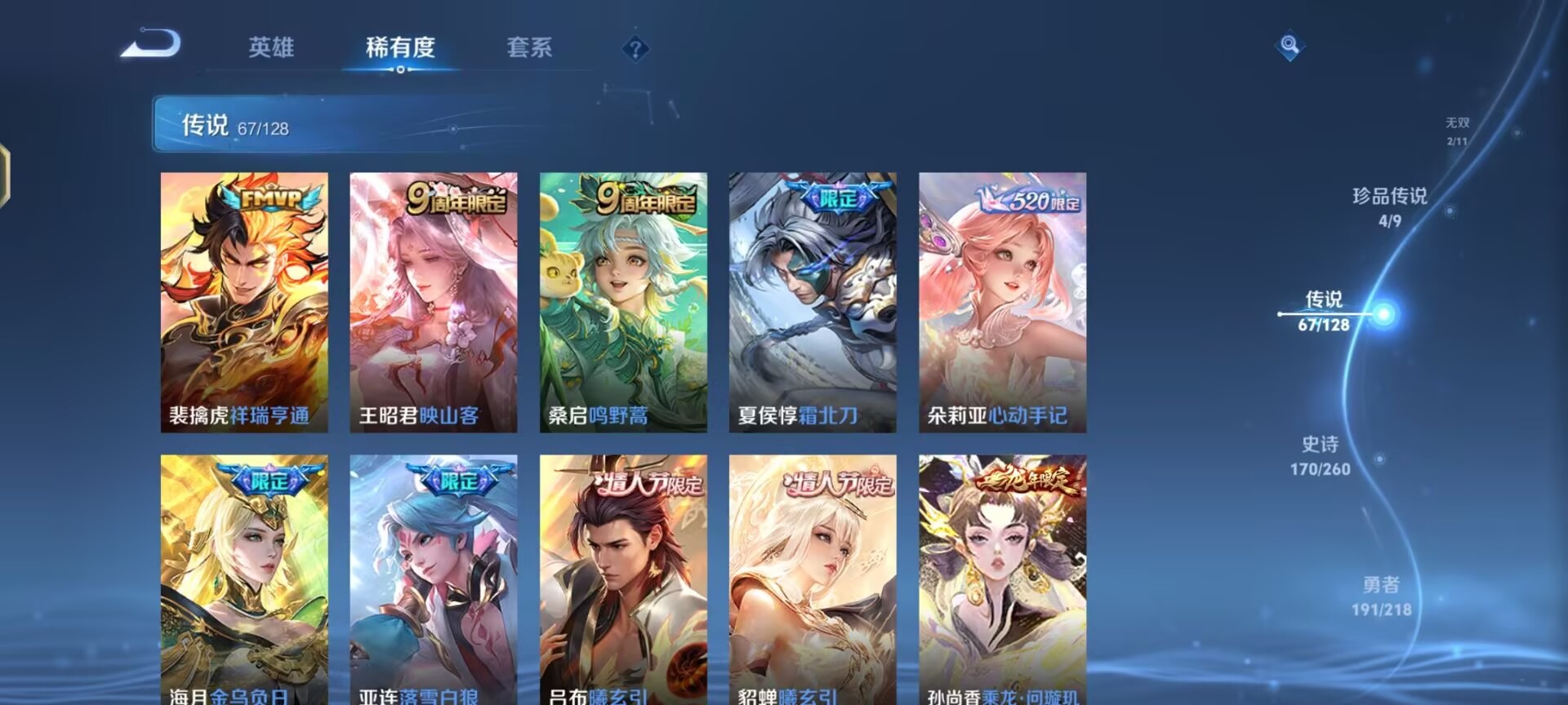 - [12062641]V8 2典藏 2珍品传说 13传说 124英雄 319皮肤 可修改实名 优质装备:无限飓风号(高达),鸣剑·曳影,怪盗基德,炽阳神光,一念神魔,云霓雀翎,末日机甲-孙尚香(绿蚂蚱),淬星耀世,超时空战士-狄仁杰,挚爱之约,妄想实况,惊梅引 珍品传说:时之奇旅-孙策 传说皮:典韦战鼓燎原,祥瑞亨通 珍宝阁皮:优雅恋人,蔷薇恋人 限定皮:愿照·九州拓(澜年限),至尊宝,遇见飞天,五谷丰年,梁祝,天狼溯光者,李小龙,冰霜恋舞曲 史诗皮:化蝶舞,龙之律动,石田雨龙,百相守梦-周瑜,茶境仙,琥珀纪元伽罗,百相守梦-百里守约,百相守梦-黄忠,紫霞仙子,电玩小子(小书包),黄金分割率,特工魅影,千年之狐,匿光侦查者,魅语,蒙恬荣光圣徽,冰冠公主,偶像歌手,电玩·爆裂旋风,暗夜猫娘,龙骑士(小龙虾),末日机甲-吕布,猫狗日记-孙策,乱世虎臣,节奏热浪,修罗,女仆咖啡,水果甜心,绅士熊喵,天才门将,星夜王子,功夫厨神,暗隐猎兽者,幽灵船长,鬼剑武藏,心灵战警,舞动绿茵,繁星吟游(呼啦呼啦),拒霜思,缤纷独角兽,乘风破浪,逐浪之夏,水晶猎龙者,曙光守护者,箭羽风息,金属风暴,原初追逐者,圣诞狂欢,圣诞恋歌,鹰眼统帅,魅力维加斯,黎明之约,无心,未来纪元-赵云