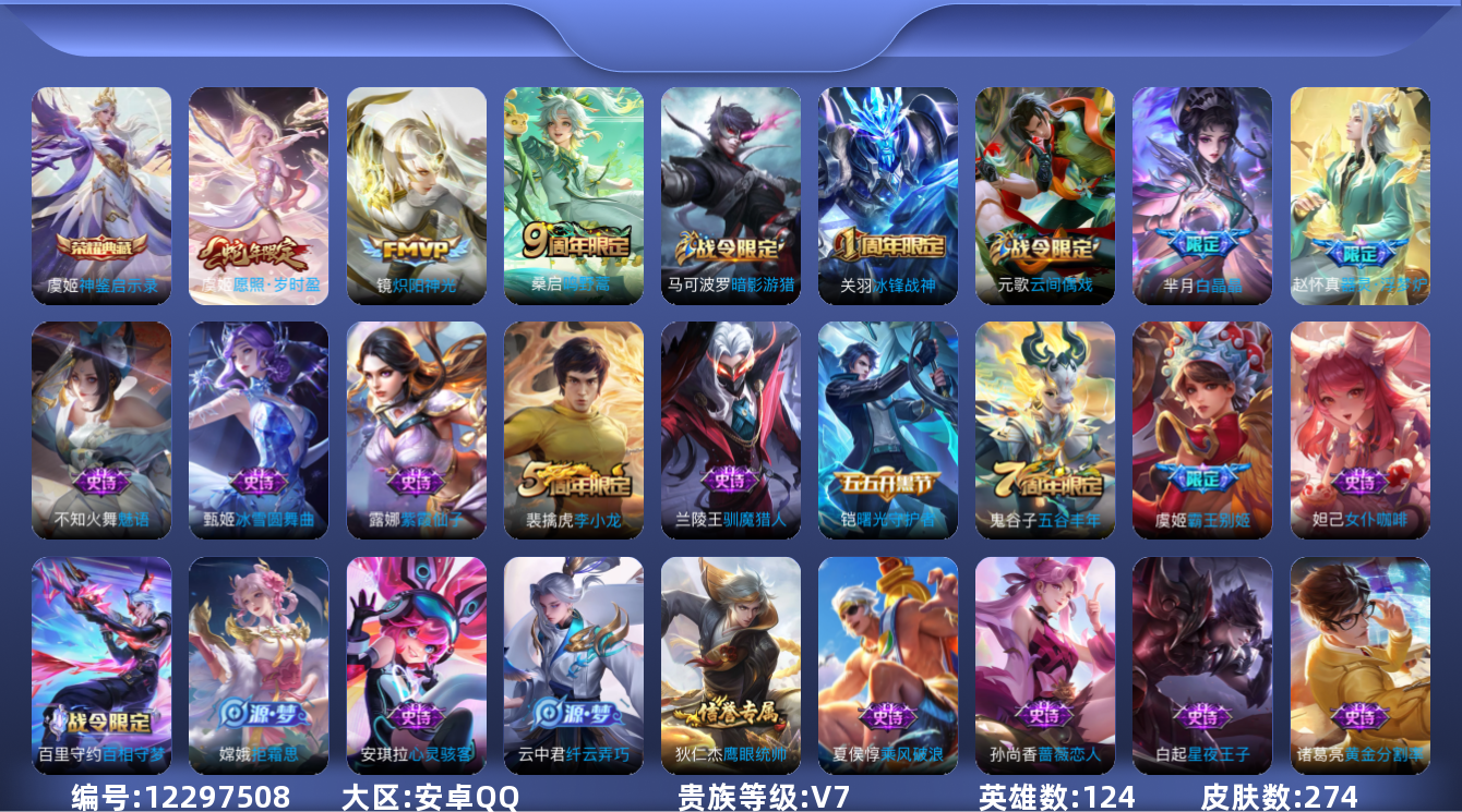 [12297508]V7 1典藏 3传说 124英雄 274皮肤 可修改实名 优质装备:神鉴启示录,炽阳神光 珍宝阁皮:万物之道,蔷薇恋人 限定皮:愿照·岁时盈(虞姬年限),逐霄战戟,鸣野蒿,白晶晶,玄嵩(庄周年限),遇见飞天,五谷丰年,冰锋战神,梁祝,李小龙,霸王别姬-虞姬 史诗皮:器灵·浮梦炉,星界战将,芈月浮光幕影,蔬乡物语(鲁班七号),百相守梦-百里守约,紫霞仙子,黄金分割率,魅语,蒙恬荣光圣徽,冰冠公主,偶像歌手,白蛇,龙骑士(小龙虾),乱世虎臣,节奏热浪,女仆咖啡,水果甜心,绅士熊喵,星夜王子,心灵骇客,德古拉伯爵,暗隐猎兽者,鬼剑武藏,心灵战警,舞动绿茵,地狱岩魂,纤云弄巧,繁星吟游(呼啦呼啦),拒霜思,缤纷独角兽,乘风破浪,逐浪之夏,曙光守护者,箭羽风息,金属风暴,原初追逐者,圣诞狂欢,圣诞恋歌,鹰眼统帅,王者之锤,暗夜贵公子,魅力维加斯,黎明之约,未来纪元-赵云