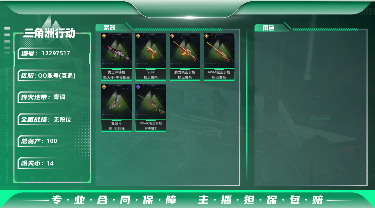 [12297517]总资产:100.8M 5传说枪械 哈夫币:14.927K 进阶安全箱(9.17到期) 可二次 可修改实名 烽火地带段位:青铜 全面战场段位:无段位 传说武器皮肤:93R-捞点薯条,AWM狙击步枪-捞点薯条,腾龙突击步枪-捞点薯条,勇士冲锋枪-能天使-午夜邮差,复合弓-黑-天际线 史诗武器皮肤:SV-98狙击步枪-林中猎手