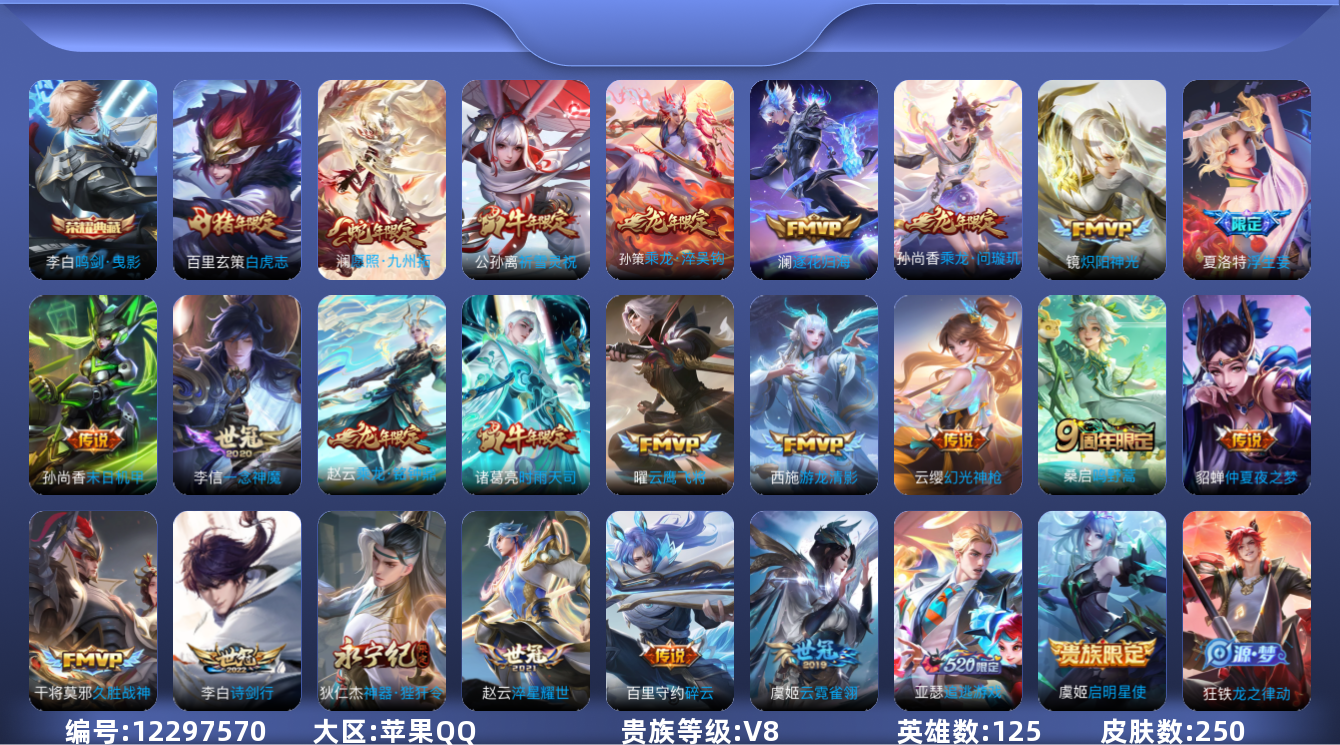 [12297570]V8 1典藏 25传说 125英雄 250皮肤 可修改实名 优质装备:鸣剑·曳影,云鹰飞将(小将军),久胜战神,炽阳神光,一念神魔,云霓雀翎,末日机甲-孙尚香(绿蚂蚱),仲夏夜之梦(大飞蛾),游龙清影(小青龙),淬星耀世,碎云,神器·狴犴令,浮生妄,追逃游戏(亚瑟),澜逐花归海 传说皮:乘龙·问璇玑(孙尚香年限),乘龙·铭钟鼎(赵云年限),乘龙·淬吴钩(孙策年限),幻光神枪 珍宝阁皮:万物之道,女武神 限定皮:愿照·九州拓(澜年限),鸣野蒿,至尊宝,白虎志(电光耗子),时雨天司(水龙头),神威(电光马子),飞衡(韩信年限),遇见飞天,诗剑行,祈雪灵祝(雪兔子),李小龙,默契交锋-花木兰 史诗皮:化蝶舞,星界战将,龙之律动,乘龙·聚宝船(安琪拉年限),乘龙·忆丹青(大乔年限),紫霞仙子,黄金分割率,千年之狐,魅语,偶像歌手,晚萤,电玩·爆裂旋风,末日机甲-吕布,时之恋人-孙尚香,乱世虎臣,修罗,女仆咖啡,摇滚巨星,水果甜心,绅士熊喵,心灵骇客,功夫厨神,德古拉伯爵,暗隐猎兽者,幽灵船长,鬼剑武藏,心灵战警,地狱岩魂,纤云弄巧,逐浪之夏,水晶猎龙者,曙光守护者,原初追逐者,圣诞狂欢,圣诞恋歌,鹰眼统帅,魅力维加斯,未来纪元-赵云