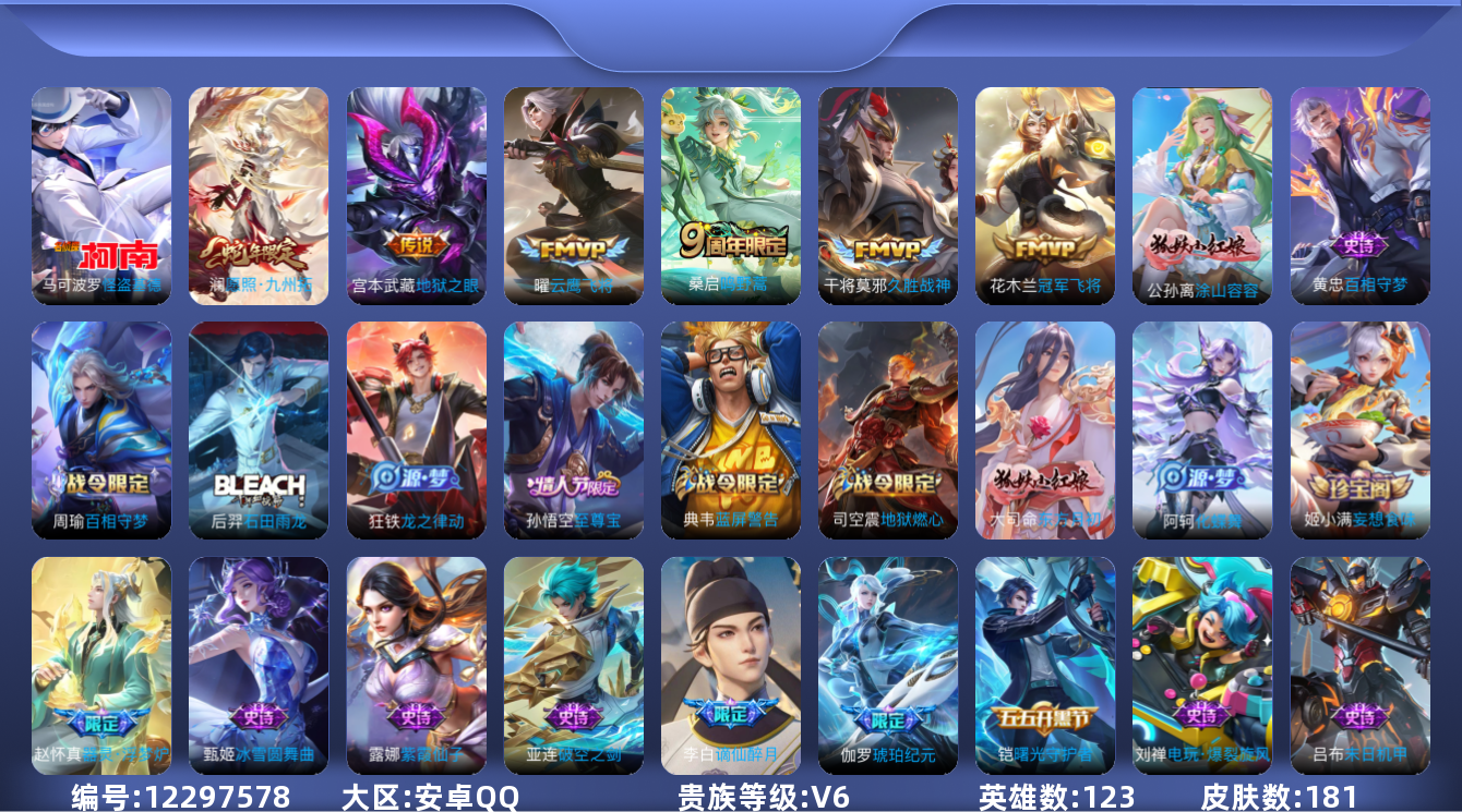 [12297578]V6 1珍品传说 6传说 123英雄 181皮肤 可修改实名 优质装备:怪盗基德,冠军飞将,云鹰飞将(小将军),久胜战神,地狱之眼,涂山容容 珍宝阁皮:妄想食味 限定皮:愿照·九州拓(澜年限),逐霄战戟,鸣野蒿,至尊宝,梁祝 史诗皮:器灵·浮梦炉,化蝶舞,星界战将,谪仙醉月,龙之律动,石田雨龙,百相守梦-周瑜,茶境仙,破空之剑,东方月初,蒙犽顽岩魄,琥珀纪元伽罗,蔬乡物语(鲁班七号),百相守梦-黄忠,紫霞仙子,苍穹之光,特工魅影,江河有灵,百解令(蒙犽),蒙恬荣光圣徽,冰冠公主,偶像歌手,电玩·爆裂旋风,末日机甲-吕布,猫狗日记-孙策,猫狗日记-大乔,水果甜心,星夜王子,心灵骇客,功夫厨神,德古拉伯爵,暗隐猎兽者,鬼剑武藏,纤云弄巧,缤纷独角兽,曙光守护者,圣诞狂欢,鹰眼统帅,黎明之约