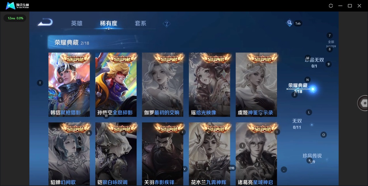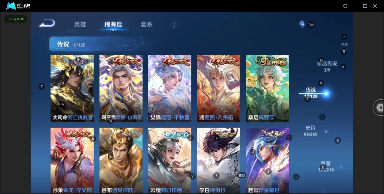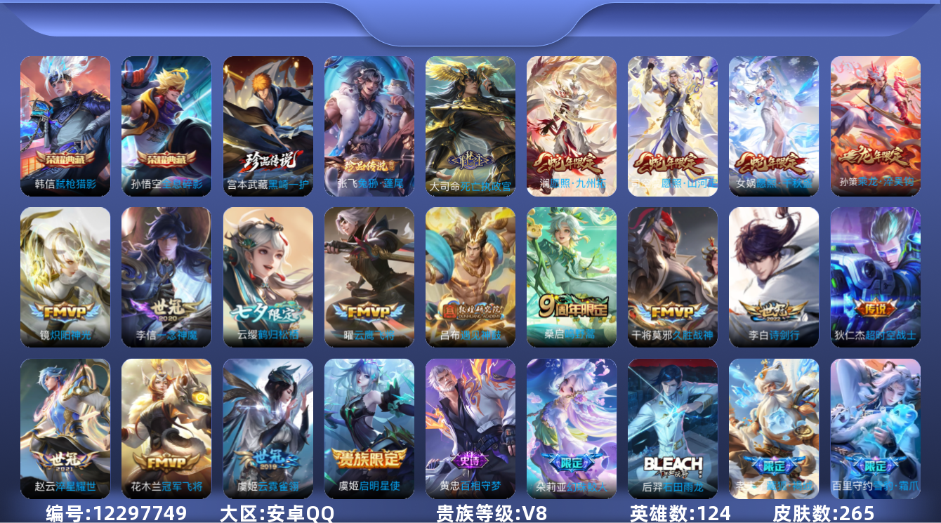 - [11882247]V8 1典藏 26传说 125英雄 319皮肤 可修改实名 优质装备:九霄神辉(木兰典藏),黄金狮子座,云鹰飞将(小将军),炽阳神光,一念神魔,云霓雀翎,飞鸢探春,游龙清影(小青龙),淬星耀世,末日机甲-孙策,无双飞将,浮生妄,记忆之芯(机甲兔),鹤归松栖(云缨),澜逐花归海 传说皮:落雪白狼 珍宝阁皮:妄想食味,优雅恋人,玩趣恶龙 限定皮:愿照·九州拓(澜年限),愿照·山河定(司空震年限),愿照·千秋盛(女娲年限),鸣野蒿,至尊宝,傲雪梅枪,前尘镜,时雨天司(水龙头),神威(电光马子),山海·碧波行(瑶年限),无限倾心-项羽,高山流水,诗剑行,降魔,五谷丰年,幽恒(沐浴露),梁祝,岱宗(典韦年限),李小龙,如梦令-后羿,孙行者,猪悟能,寅虎·瑞焰(虎皮蛋子),寅虎·心曲(虎婆),寅虎·赤拳(老虎年限),时之奇旅-妲己,山海·玄木吟(马可年限) 史诗皮:鸭鸭历险记-刘禅,器灵·浮梦炉,瑰影绮梦,化蝶舞,星界战将,龙之律动,藏狐·褐绒,石田雨龙,百相守梦-周瑜,茶境仙,幻珠鲛人,海诺心动手记,破空之剑,东方月初,蒙犽顽岩魄,蔬乡物语(鲁班七号),超元猎域,乘龙·忆丹青(大乔年限),琥珀纪元伽罗,百相守梦-百里守约,守夜人,百相守梦-黄忠,紫霞仙子,电玩小子(小书包),黄金分割率,特工魅影,千年之狐,永昼,百相守梦(刘备),百相守梦(关羽),电玩·爆裂旋风,江河有灵,雪夜绮愿(周瑜),高渐离燃音魔法,蒙恬荣光圣徽,暗夜猫娘,魅语,末日机甲-吕布,猫狗日记-孙策,猫狗日记-大乔,乱世虎臣,节奏热浪,修罗,女仆咖啡,摇滚巨星,水果甜心,天才门将,星夜王子,心灵骇客,功夫厨神,德古拉伯爵,暗隐猎兽者,幽灵船长,鬼剑武藏,暗渊魔法,心灵战警,乐园奇幻夜,天秀·启明,舞动绿茵,地狱岩魂,纤云弄巧,拒霜思,缤纷独角兽,乘风破浪,逐浪之夏,龙鼓争鸣,月团寄思,水晶猎龙者,曙光守护者,原初追逐者,圣诞狂欢,圣诞恋歌,鹰眼统帅,暗夜贵公子,魅力维加斯,雪上飞焰,奇遇舞章,顽趣-阿古朵,无心,未来纪元-赵云