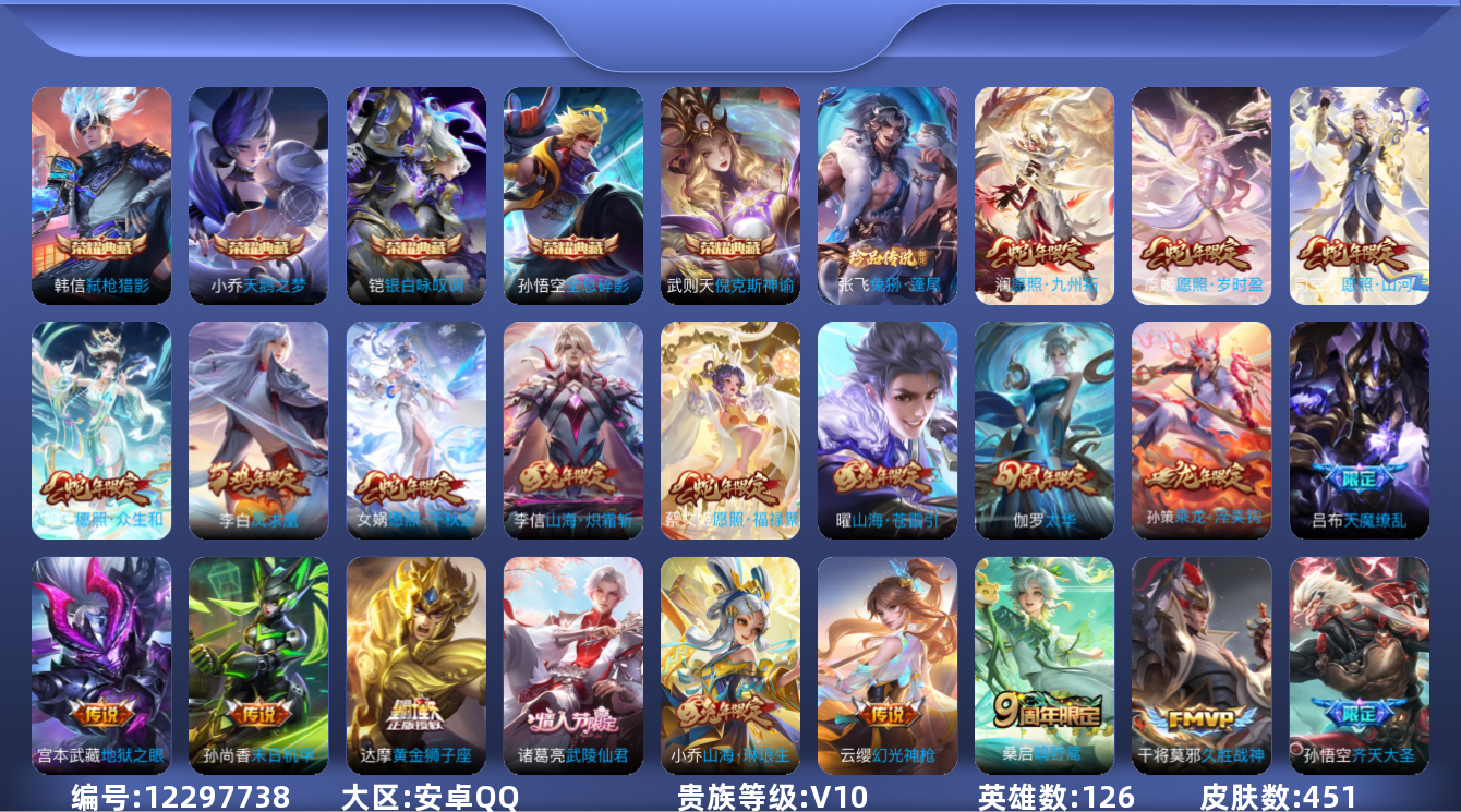 [12297738]V10 5典藏 1珍品传说 35传说 126英雄 451皮肤 典藏英雄武则天 可修改实名 优质装备:天鹅之梦(小乔典藏),倪克斯神谕(宇宙婆娘),全息碎影(猴子典藏),银白咏叹调(倪克斯侍卫),弑枪猎影(韩信典藏),黄金狮子座,黄金射手座,冠军飞将,黄金白羊座,久胜战神,末日机甲-孙尚香(绿蚂蚱),地狱火,零号·赤焰,地狱之眼,音你心动-周瑜,时之恋人-刘备(电焊工),超时空战士-狄仁杰,山海·炽霜斩(李信年限),山海·琳琅生(小乔年限),山海·苍雷引(电光曜子),燃星之曲,艾琳觅芳踪,涂山容容 珍品传说:兔狲·蓬尾 传说皮:乘龙·淬吴钩(孙策年限),幻光神枪 珍宝阁皮:妄想食味,玩趣恶龙 限定皮:愿照·九州拓(澜年限),愿照·福禄聚(蔡文姬年限),愿照·岁时盈(虞姬年限),愿照·山河定(司空震年限),愿照·众生和(妲己年限),愿照·千秋盛(女娲年限),逐霄战戟,陌上桑,鸣野蒿,至尊宝,凤求凰(白切鸡),凤凰于飞,太华(伽罗年限),武陵仙君(小桃花),时之彼端,神威(电光马子),飞衡(韩信年限),玄嵩(庄周年限),山海·碧波行(瑶年限),无限倾心-项羽,影龙天霄,遇见飞天,无限倾心-虞姬,齐天大圣,五谷丰年,青龙志(铠年限),幽恒(沐浴露),游园惊梦,龙胆,逐梦之星,烈魂,岱宗(典韦年限),虎魄,天狼征服者,天狼绘梦者,李小龙,逐梦之影,朱雀志(守约年限),辉光之辰,大圣娶亲,引擎之心,天魔缭乱,青春决赛季,蜜橘之夏,山海·玄木吟(马可年限) 史诗皮:鸭鸭历险记-刘禅,器灵·浮梦炉,化蝶舞,灵蛊蚀心,星界战将,谪仙醉月,龙之律动,雪豹·霜爪,石田雨龙,百相守梦-周瑜,茶境仙,幻珠鲛人,怒海争锋,撼地雄心,破空之剑,蒙犽顽岩魄,埋骨钱,芈月浮光幕影,琥珀纪元伽罗,蔬乡物语(鲁班七号),百相守梦-百里守约,百相守梦-黄忠,织梦人,紫霞仙子,苍穹之光,电玩小子(小书包),白龙吟,黄金分割率,特工魅影,千年之狐,江河有灵,雪夜绮愿(周瑜),魅语,百解令(蒙犽),高渐离燃音魔法,蒙恬荣光圣徽,无限星赏官,冰冠公主,青蛇,偶像歌手,晚萤,暗夜猫娘,龙骑士(小龙虾),末日机甲-吕布,猫狗日记-孙策,猫狗日记-大乔,时之恋人-孙尚香,乱世虎臣,节奏热浪,修罗,女仆咖啡,摇滚巨星,水果甜心,绅士熊喵,天才门将,星夜王子,心灵骇客,功夫厨神,德古拉伯爵,暗隐猎兽者,幽灵船长,鬼剑武藏