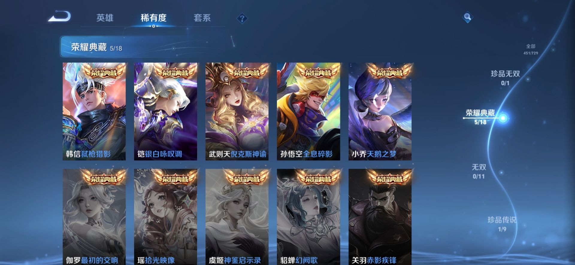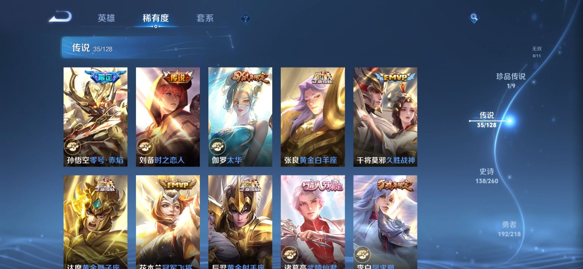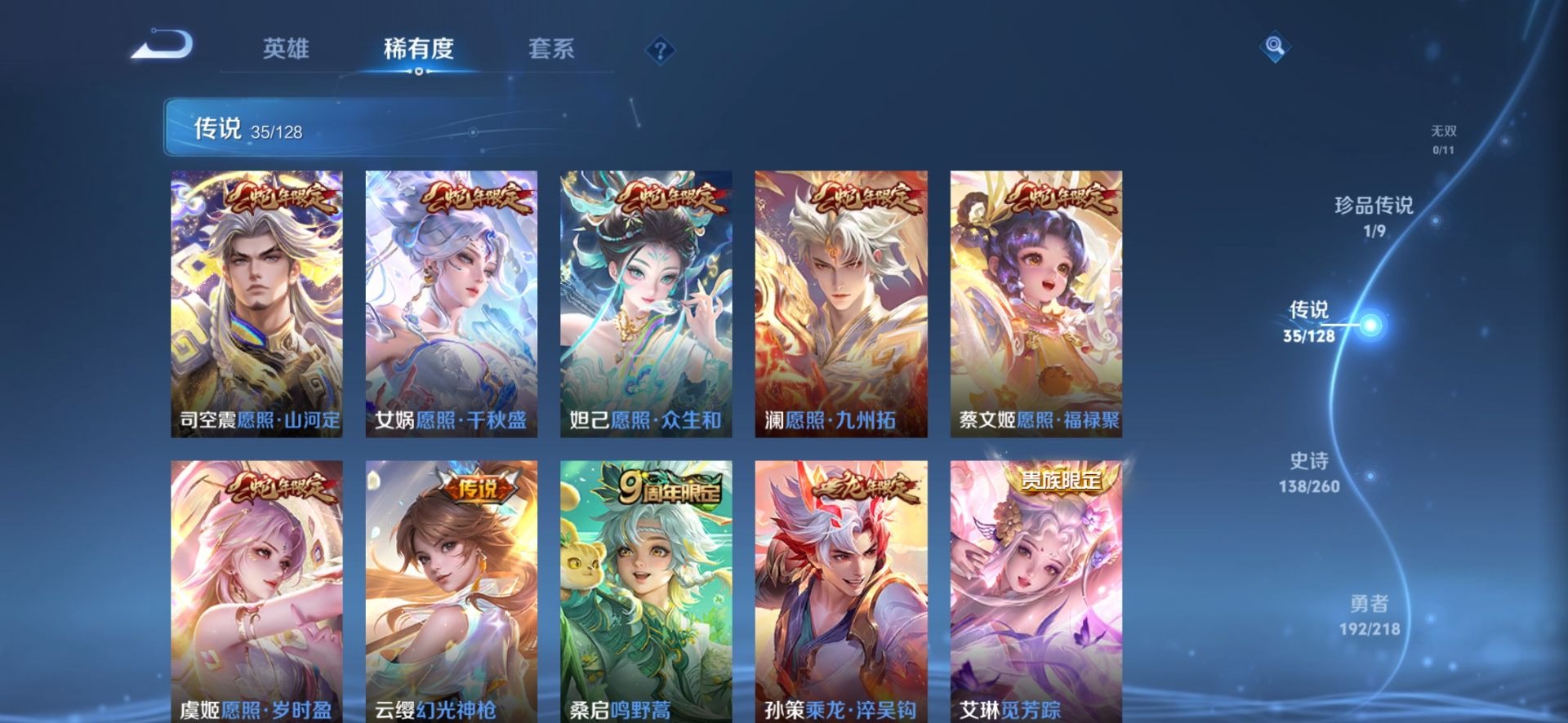 黄忠烈魂,甄姬幽恒,铠青龙志,曹操天狼征服者,伽罗太华,张飞虎魄,赵云龙胆,典韦岱宗,后羿辉光之辰,庄周玄嵩,司空震愿照·山河定,兰陵王影龙天霄,公孙离蜜橘之夏,裴擒虎李小龙,上官婉儿天狼绘梦者,花木兰青春决赛季,马可波罗逐梦之星,马可波罗山海·玄木吟,艾琳陌上桑,桑启鸣野蒿,女娲愿照·千秋盛,孙悟空大圣娶亲,孙悟空至尊宝,马超神威,赵云引擎之心,妲己时之彼端,妲己愿照·众生和,韩信飞衡,韩信逐梦之影,百里守约朱雀志,蔡文姬愿照·福禄聚,瑶山海·碧波行,澜愿照·九州拓,虞姬愿照·岁时盈,王昭君凤凰于飞
