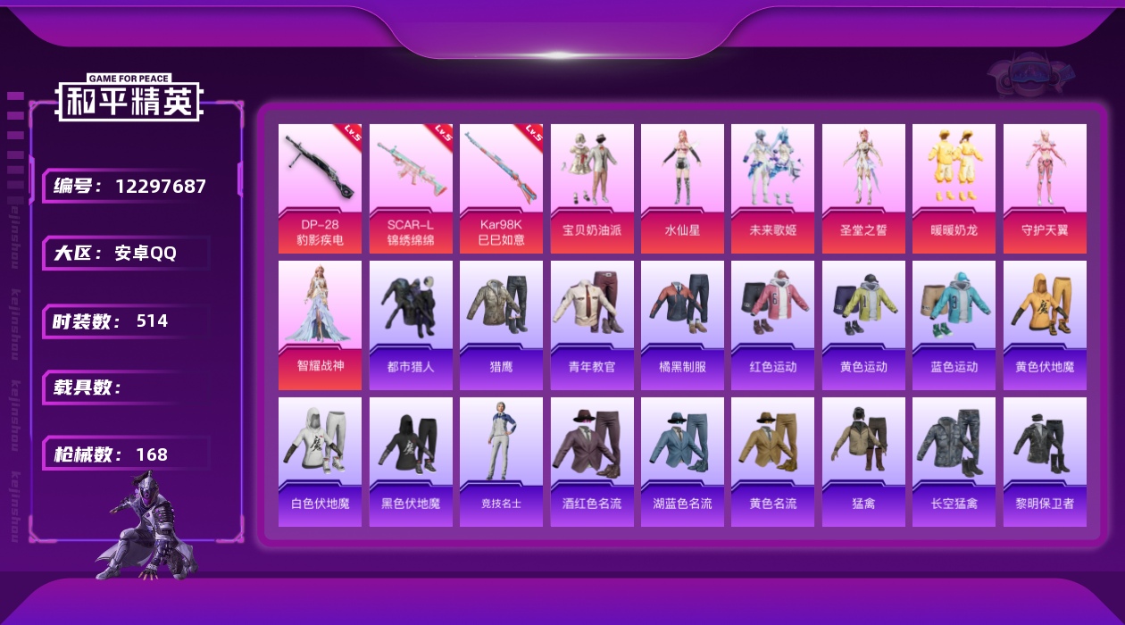 - [12658900]安卓 手Q-2粉装-6特效枪-0载具-2粉色飞行器-35807热力值-1王牌印记-69套装-134枪皮 【粉色套装】:角色-智耀战神,粉装-星穹咏叹调 【粉色枪皮等级】:SCAR-L-锦绣绵绵(五级),AUG-暖羊咩咩(五级),Kar98K-巳巳如意(五级),Mk14-甜梦熊击(五级),AMR-智耀战神(七级),DP-28-豹影疾电(五级) 【粉色枪皮】:SCAR-L-锦绣绵绵,AUG-暖羊咩咩,Kar98K-巳巳如意,Mk14-甜梦熊击,AMR-智耀战神,DP-28-豹影疾电 【粉色飞行器】:镜光幻境飞行翼,终晖之翼飞行器 【粉色降落伞】:暗夜鎏金降落伞,镜光幻境降落伞,圣堂之誓降落伞,桃粉嫣然降落伞,智耀战神降落伞,幻星舰长降落伞 【稀有套装】:套装-巳巳如意,套装-兰香蝶语,套装-燕燕于飞,套装-鱼渊荷华,套装-新风雅兰,套装-粉恋花,套装-紫幽梦,套装-蓝冰羽,套装-星渊小夜曲,套装-霓虹热舞,套装-云朵鹅,套装-雪绒豹,套装-朱霞炽焰,套装-凌霄紫焰,套装-擎苍青焰,玩偶服-美羊羊,角色-敖闰,角色-绯色魅影 【稀有枪皮】:AKM-彩虹符号,AKM-破晓战魂,AKM-霓虹街区,M16A4-最终圣卫者,SCAR-L-炫彩节奏,SCAR-L-玉兔迎春,SCAR-L-红色方程式,SCAR-L-冷漠罗丽,M416-红色方程式,M416-蓝色火焰,M416-萌萌史莱姆,GROZA-田园牧歌,AUG-耀粉歌者,QBZ-彩虹符号,M762-天降萌叽,M762-彩虹符号,M762-云朵鹅,G36C-星穹咏叹调,AC-VAL-天降萌叽,AC-VAL-快闪甜心,蜜獾-天降萌叽,ARX-凌霄紫焰,UZI-啾咪啾咪,UZI-天降萌叽,UMP45-蓝色火焰,Vector-焰鹰斗篷,Vector-生命誓言,Vector-田园牧歌,汤姆逊-耀粉歌者,汤姆逊-幻星舰长,JS9-凌霄紫焰,P90-快闪甜心,P90-巳巳如意,Kar98K-彩虹符号,Kar98K-红色方程式,Kar98K-星穹咏叹调,M24-幻彩电音,AWM-焰鹰斗篷,VSS-田园牧歌,Mini14-耀粉歌者,AMR-镜光幻境,MK20-H-快闪甜心,MK20-H-圣域龙灵,SVD-云朵鹅,S686-彩虹符号,S686-生命誓言,S686-巳巳如意,S12K-玩趣呆呆,S12K-破晓战魂,S12K-智耀战神,DBS-焰鹰斗