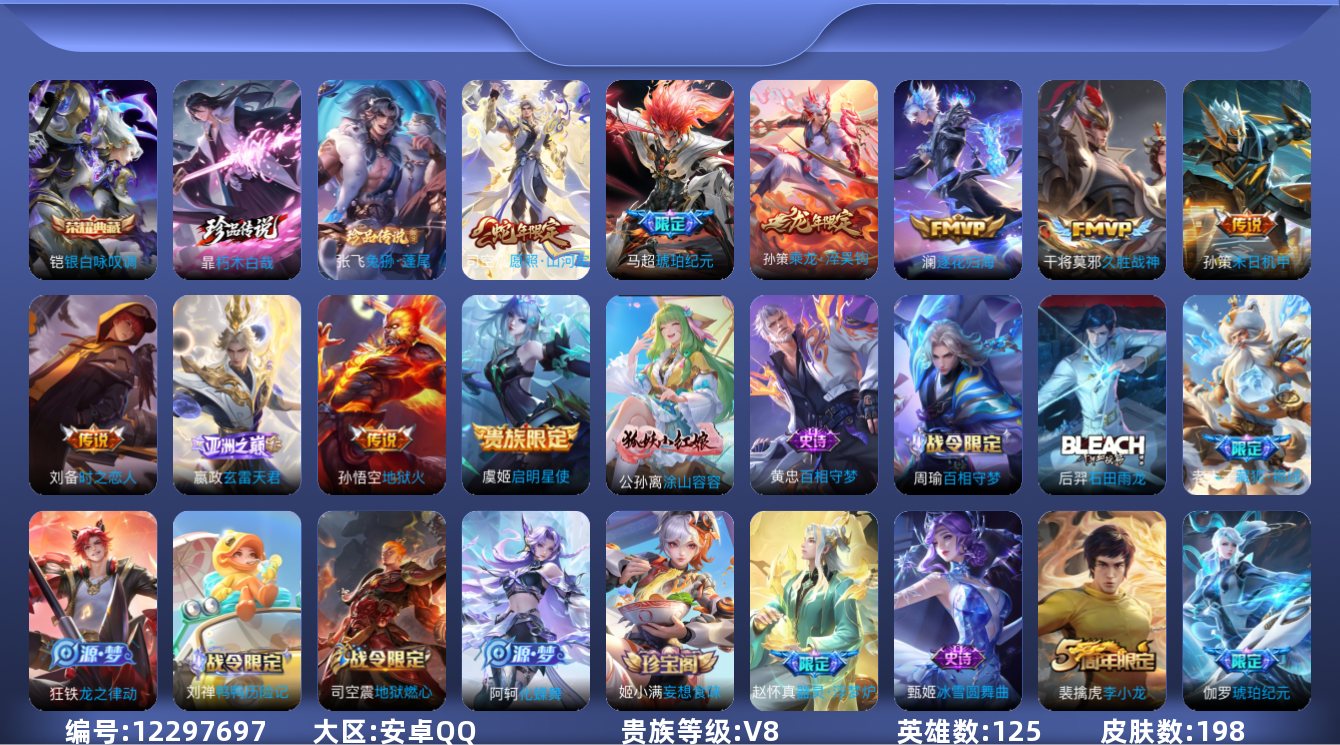 [12297697]【商品标题】:安卓Q-V8-最强王者段位-125英雄-198皮肤-1典藏-0珍品无双-0无双-2珍品传说-10传说-55史诗