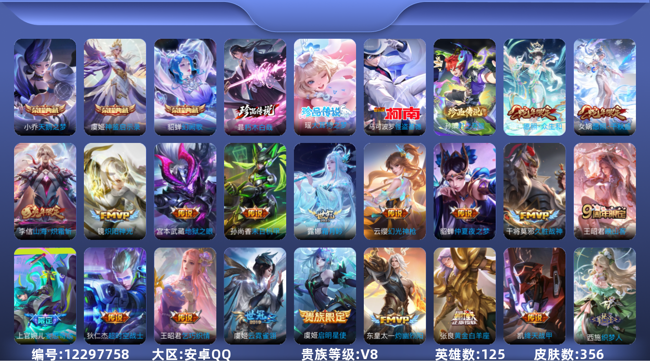 [12297758]V8 3典藏 4珍品传说 19传说 125英雄 356皮肤 可修改实名 优质装备:天鹅之梦(小乔典藏),幻阙歌(貂蝉典藏),神鉴启示录,怪盗基德,大耳狗之梦,朽木白哉,绛天战甲(鸡嘴战神),黄金白羊座,久胜战神,炽阳神光,云霓雀翎,末日机甲-孙尚香(绿蚂蚱),仲夏夜之梦(大飞蛾),地狱之眼,乞巧织情,超时空战士-狄仁杰,山海·炽霜斩(李信年限),灼幽烈阳,妄想奇谈,霜月吟 珍品传说:时之奇旅-孙策 传说皮:幻光神枪 珍宝阁皮:优雅恋人,蔷薇恋人 限定皮:愿照·众生和(妲己年限),愿照·千秋盛(女娲年限),映山客,白鹤梁神女,遇见飞天,匿光决锋者,五谷丰年,游园惊梦,梁祝,李小龙,逐梦之光,辉光之辰,如梦令-后羿,大圣娶亲,美猴王,玉兔公主,唐三藏,时之奇旅-妲己 史诗皮:赞萌露比,鸭鸭历险记-刘禅,器灵·浮梦炉,狼魂孤将,化蝶舞,星界战将,龙之律动,百相守梦-周瑜,茶境仙,幻珠鲛人,怒海争锋,琥珀纪元伽罗,蔬乡物语(鲁班七号),百相守梦-百里守约,百相守梦-黄忠,织梦人,遇见神鹿,紫霞仙子,苍穹之光,电玩小子(小书包),黄金分割率,特工魅影,千年之狐,江河有灵,匿光侦查者,魅语,蒙恬荣光圣徽,冰冠公主,青蛇,偶像歌手,白蛇,电玩·爆裂旋风,百相守梦(刘备),龙骑士(小龙虾),末日机甲-吕布,猫狗日记-孙策,猫狗日记-大乔,乱世虎臣,节奏热浪,女仆咖啡,摇滚巨星,水果甜心,绅士熊喵,天才门将,星夜王子,心灵骇客,时之奇旅-安琪拉,功夫厨神,德古拉伯爵,暗隐猎兽者,幽灵船长,鬼剑武藏,心灵战警,舞动绿茵,地狱岩魂,诗语江南,纤云弄巧,繁星吟游(呼啦呼啦),缤纷独角兽,乘风破浪,逐浪之夏,月团寄思,水晶猎龙者,曙光守护者,箭羽风息,金属风暴,圣诞狂欢,圣诞恋歌,鹰眼统帅,暗夜贵公子,魅力维加斯,黎明之约,奇遇舞章,天秀·音浪,未来纪元-赵云