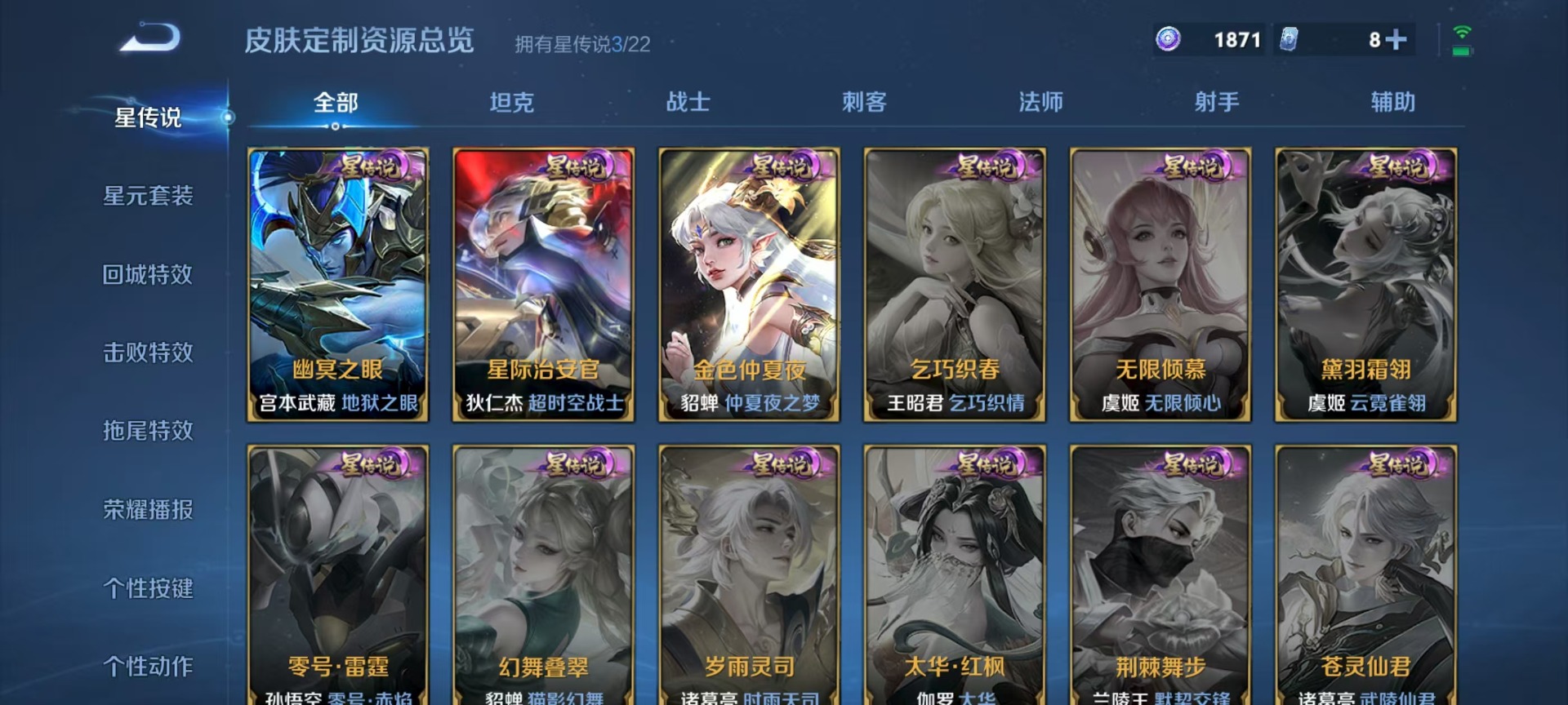 刘邦夺宝奇兵,夏侯惇朔风刀,老夫子醍醐杖,沈梦溪星空之诺,沈梦溪大漠名商,盾山御銮,曹操烛龙,孙膑妖精王,苏烈千军破阵,典韦穷奇,典韦蓝屏警告,达摩沙漠行僧,牛魔御旌,项羽苍威无极,鲁班七号狮舞东方,吕布猎兽之王,庄周蜃楼王,兰陵王金庭之子,裴擒虎擒涛扼浪,鲁班大师探海日志,明世隐疑决卦,蒙犽狂想玩偶喵,马可波罗暗影游猎,白起狰,亚瑟狮心王,鬼谷子原初探秘者,张良古海寻踪,女娲朔望之晖,桑启海盐诗旅,狄仁杰万华元夜,嬴政白昼王子,芈月重明,扁鹊炼金王,李元芳银河之约,李元芳云中旅人,弈星混沌棋,虞姬凯尔特女王,米莱狄御霄,钟馗神迹守卫,钟馗驱傩正仪,狂铁御狮,太乙真人饕餮