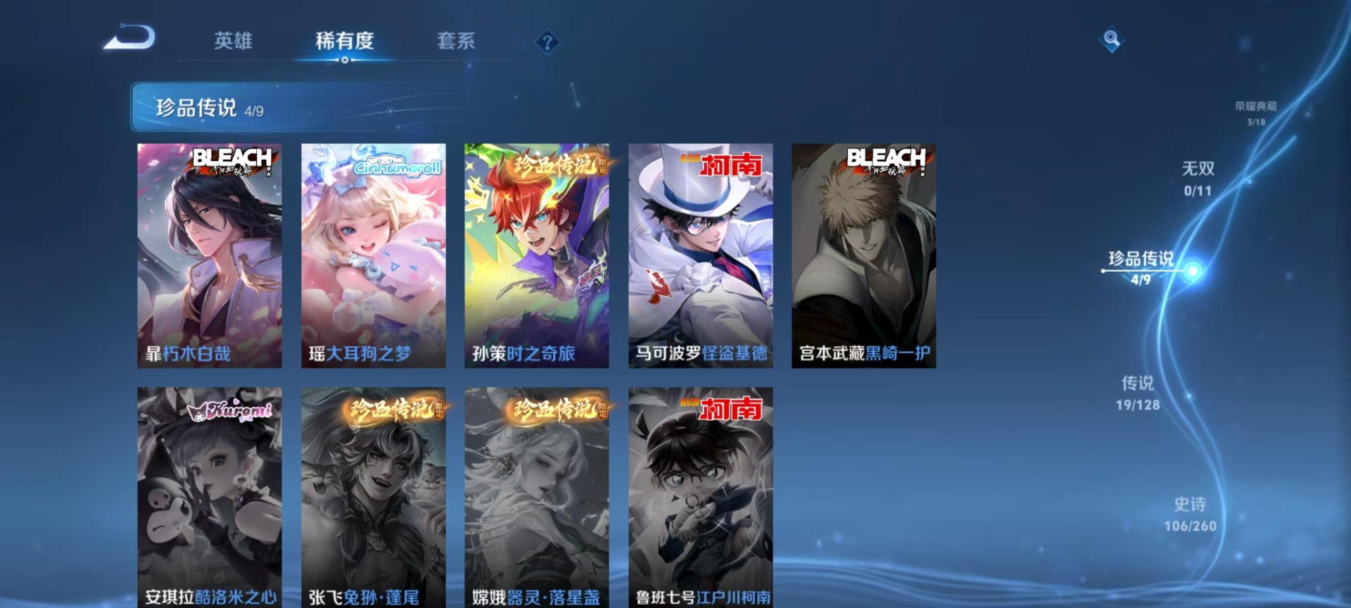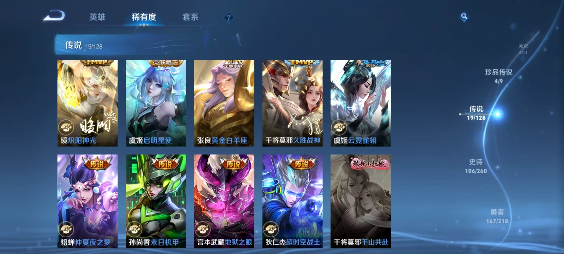 - [11528858]V7 1典藏 7传说 125英雄 291皮肤 可修改实名 优质装备:神鉴启示录,炽阳神光,浮生妄,霜月吟,澜逐花归海 传说皮:落雪白狼 珍宝阁皮:妄想食味,优雅恋人,蔷薇恋人 限定皮:愿照·千秋盛(女娲年限),陌上桑,鸣野蒿,至尊宝,傲雪梅枪,遇见飞天,五谷丰年,龙胆,李小龙,猪悟能,引擎之心,美猴王 史诗皮:器灵·浮梦炉,星界战将,撼地雄心,破空之剑,战舞者,东方月初,埋骨钱,芈月浮光幕影,决胜骁骑,蔬乡物语(鲁班七号),百相守梦-百里守约,百相守梦-黄忠,特工魅影,千年之狐,江河有灵,匿光侦查者,鹤归松栖(赵怀真),雪夜绮愿(周瑜),真我赫兹(镜),百解令(蒙犽),高渐离燃音魔法,蒙恬荣光圣徽,匿光破解者,偶像歌手,暗夜猫娘,末日机甲-吕布,猫狗日记-孙策,节奏热浪,修罗,女仆咖啡,摇滚巨星,水果甜心,天才门将,星夜王子,心灵骇客,德古拉伯爵,暗隐猎兽者,鬼剑武藏,天秀·启明,纤云弄巧,拒霜思,缤纷独角兽,乘风破浪,逐浪之夏,月团寄思,水晶猎龙者,金属风暴,原初追逐者,圣诞狂欢,鹰眼统帅,魅力维加斯,赏金猎手,无心,未来纪元-赵云