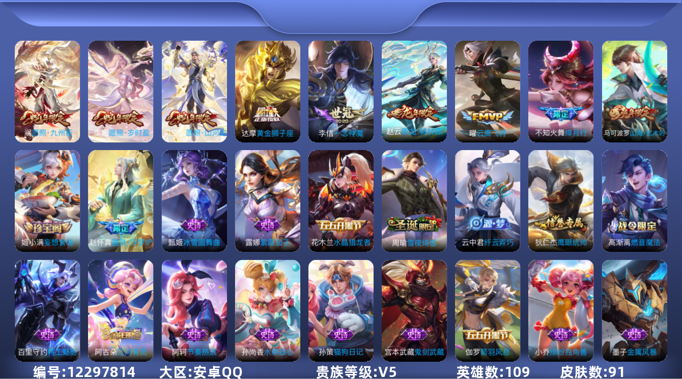 [12297814]V5 8传说 109英雄 91皮肤 可修改实名 优质装备:黄金狮子座,云鹰飞将(小将军),一念神魔 传说皮:乘龙·铭钟鼎(赵云年限) 珍宝阁皮:妄想食味 限定皮:愿照·九州拓(澜年限),愿照·岁时盈(虞姬年限),愿照·山河定(司空震年限),绯月行,山海·玄木吟(马可年限) 史诗皮:器灵·浮梦炉,紫霞仙子,特工魅影,雪夜绮愿(周瑜),江河有灵,高渐离燃音魔法,猫狗日记-孙策,乱世虎臣,节奏热浪,水果甜心,功夫厨神,鬼剑武藏,纤云弄巧,缤纷独角兽,水晶猎龙者,箭羽风息,金属风暴,圣诞恋歌,鹰眼统帅,魅力维加斯