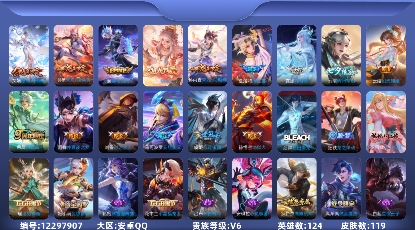 - [11608369]V9 2典藏 14传说 124英雄 336皮肤 可修改实名 女号 优质装备:鸣剑·曳影,全息碎影(猴子典藏),冠军飞将,猫影幻舞,一念神魔,地狱火,仲夏夜之梦(大飞蛾),零号·赤焰 珍宝阁皮:优雅恋人,女武神 限定皮:逐霄战戟,鸣野蒿,至尊宝,白虎志(电光耗子),凤求凰(白切鸡),凤凰于飞,太华(伽罗年限),武陵仙君(小桃花),时之彼端,时雨天司(水龙头),飞衡(韩信年限),瑞麟志(木兰年限),遇见飞天,青龙志(铠年限),冰锋战神,游园惊梦,梁祝,逐梦之翼,天狼征服者,天狼绘梦者,李小龙,逐梦之影,逐梦之光,朱雀志(守约年限),永曜之星,辉光之辰,如梦令-后羿,霸王别姬-项羽,圣诞老人,一生所爱,大圣娶亲,引擎之心,美猴王 史诗皮:藏狐·褐绒,炽弈燎原,芈月浮光幕影,蔬乡物语(鲁班七号),百相守梦-百里守约,紫霞仙子,电玩小子(小书包),白龙吟,黄金分割率,特工魅影,千年之狐,末日机甲-莱西奥,魅语,无限星赏官,冰冠公主,偶像歌手,白蛇,晚萤,暗夜猫娘,龙骑士(小龙虾),末日机甲-吕布,猫狗日记-孙策,猫狗日记-大乔,乱世虎臣,节奏热浪,修罗,女仆咖啡,摇滚巨星,水果甜心,绅士熊喵,天才门将,星夜王子,心灵骇客,功夫厨神,德古拉伯爵,暗隐猎兽者,幽灵船长,鬼剑武藏,心灵战警,天秀·启明,舞动绿茵,地狱岩魂,诗语江南,纤云弄巧,繁星吟游(呼啦呼啦),缤纷独角兽,乘风破浪,逐浪之夏,月团寄思,水晶猎龙者,曙光守护者,箭羽风息,金属风暴,原初追逐者,圣诞狂欢,圣诞恋歌,鹰眼统帅,王者之锤,暗夜贵公子,魅力维加斯,黎明之约,未来纪元-赵云