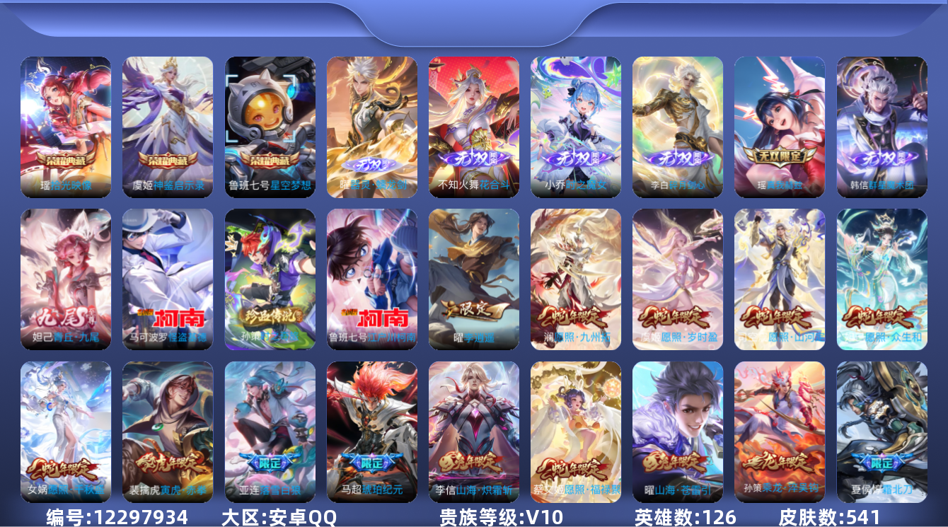 [12297934]V10 3典藏 7无双 3珍品传说 81传说 126英雄 541皮肤 典藏英雄武则天 可修改实名 优质装备:星空梦想(太空人),真我赫兹(瑶)(瑶无双),青丘·九尾(妲己无双),碎月剑心(李白无双),神鉴启示录,小乔时之魔女(小乔无双),韩信群星魔术团(韩信无双),花合斗,拾光映像(瑶典藏),器灵·螭龙剑,江户川柯南,怪盗基德,黄金狮子座,黄金射手座,冠军飞将,云鹰飞将(小将军),久胜战神,炽阳神光,一念神魔,末日机甲-孙尚香(绿蚂蚱),地狱火,仲夏夜之梦(大飞蛾),音你心动-小乔,零号·赤焰,海洋之心,地狱之眼,音你心动-周瑜,李逍遥,乞巧织情,时之恋人-刘备(电焊工),游龙清影(小青龙),淬星耀世,超时空战士-狄仁杰,末日机甲-孙策,挚爱之约,挚爱花嫁,无双飞将,山海·炽霜斩(李信年限),山海·琳琅生(小乔年限),山海·苍雷引(电光曜子),炽翼辉光(娃娃菜牛角包),青丘·九尾,百相守梦(张飞),追逃游戏(亚瑟),追逃游戏(安琪拉),鹤羽星尊,灼幽烈阳,妄想实况,妄想奇谈,鹤归松栖(云缨),惊梅引,遇见神鼓,鲁班七号-时之奇旅,大乔-时之奇旅,霜月吟,澜逐花归海,艾琳觅芳踪,琥珀纪元铠,琥珀纪元马超,金乌负日,黄金天蝎座,云中君群星魔术团,朵莉亚心动手记,牧神诗旅,玄雷天君 珍品传说:时之奇旅-孙策 传说皮:乘龙·问璇玑(孙尚香年限),乘龙·铭钟鼎(赵云年限),乘龙·淬吴钩(孙策年限),貂蝉曦玄引,吕布曦玄引,典韦战鼓燎原,落雪白狼,铠冥王哈迪斯,幻光神枪 珍宝阁皮:妄想食味,女武神,玩趣恶龙 限定皮:愿照·九州拓(澜年限),愿照·福禄聚(蔡文姬年限),愿照·岁时盈(虞姬年限),愿照·山河定(司空震年限),愿照·众生和(妲己年限),愿照·千秋盛(女娲年限),逐霄战戟,映山客,陌上桑,鸣野蒿,夏侯惇霜北刀,至尊宝,武陵仙君(小桃花),异界灵契(白毛香),傲雪梅枪,寅虎·展翼(孙膑年限),时之彼端,魔法小厨娘,白晶晶,山海·碧波行(瑶年限),至美·乘鲤谣,至美·化雀舞,影龙天霄,遇见飞天,高山流水,诗剑行,齐天大圣,匿光决锋者,怒海麟威,五谷丰年,青龙志(铠年限),冰锋战神,幽恒(沐浴露),游园惊梦,梁祝,御风骁将(吕布年限),逐梦之星,烈魂,岱宗(典韦年限),虎魄,逐梦之音,李小龙,玄武志(苏烈年限),辉光之辰,如梦令-嫦娥,如梦令-后羿,奇迹圣诞,孙行者,猪悟