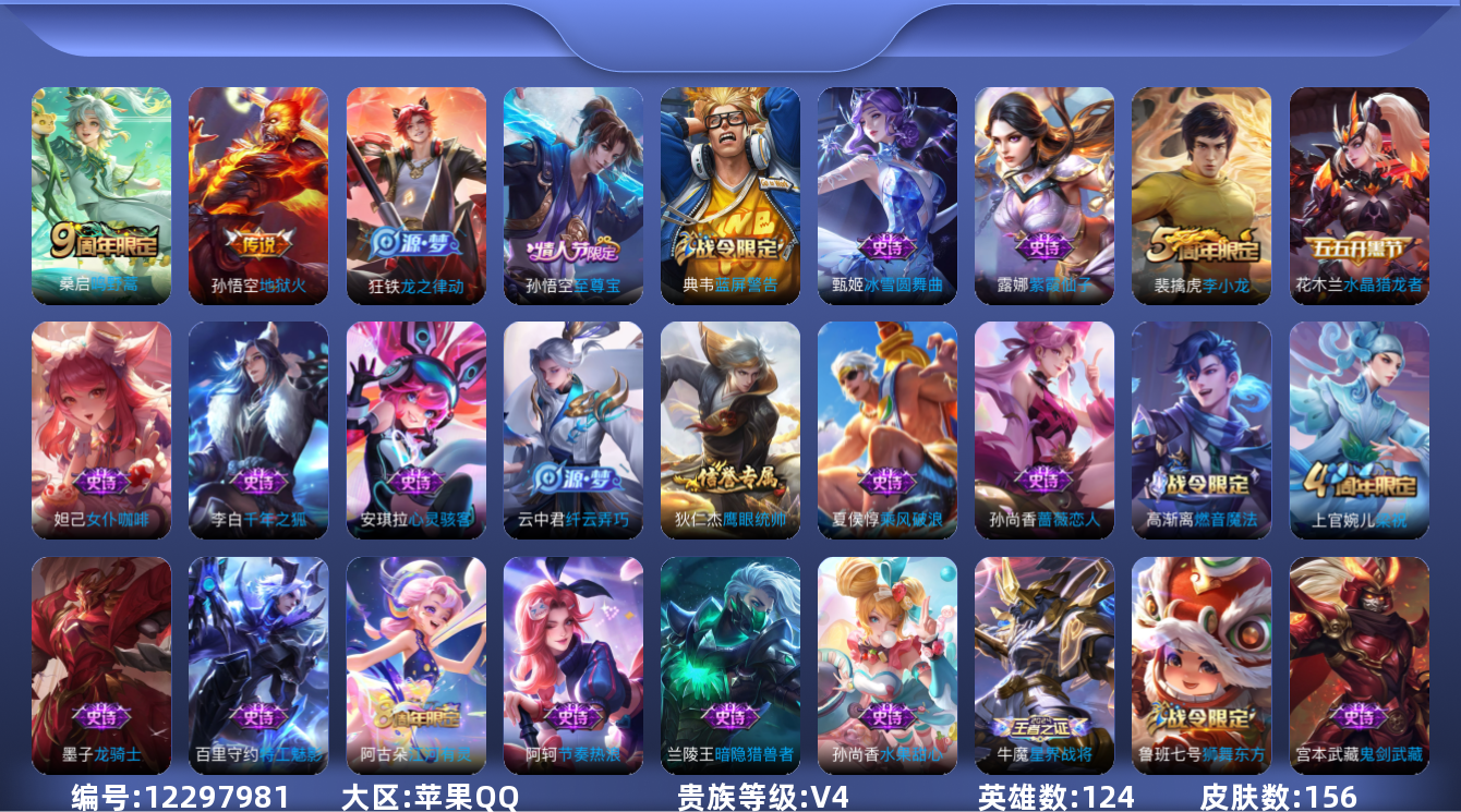 - [11971891]V9 1典藏 2无双 18传说 123英雄 227皮肤 可修改实名 优质装备:星域神启(倪克斯贼亮),花合斗,离恨烟(公孙离无双),久胜战神,炽阳神光,一念神魔,仲夏夜之梦(大飞蛾),地狱之眼,时之恋人-刘备(电焊工),碎云,浮生妄,鹤羽星尊,妄想实况,澜逐花归海 珍宝阁皮:蔷薇恋人 限定皮:逐霄战戟,鸣野蒿,前尘镜,时雨天司(水龙头),瑞麟志(木兰年限),怒海麟威,五谷丰年,青龙志(铠年限),御风骁将(吕布年限),逐梦之星,天狼绘梦者,朱雀志(守约年限),一生所爱,热情桑巴,无尽星芒,深海之息(深海大菠萝),唐三藏,时之奇旅-妲己,神器·万象笔,山海·玄木吟(马可年限) 史诗皮:破空之剑,涂山红红,东方月初,蒙犽顽岩魄,上官婉儿群星魔术团,百相守梦-百里守约,紫霞仙子,电玩小子(小书包),黄金分割率,特工魅影,千年之狐,永昼,末日机甲-莱西奥,真我赫兹(百里守约),蒙恬荣光圣徽,冰冠公主,青蛇,偶像歌手,晚萤,电玩·爆裂旋风,暗夜猫娘,末日机甲-吕布,猫狗日记-孙策,时之恋人-孙尚香,乱世虎臣,节奏热浪,女仆咖啡,摇滚巨星,水果甜心,星夜王子,心灵骇客,暗隐猎兽者,幽灵船长,鬼剑武藏,地狱岩魂,乘风破浪,逐浪之夏,水晶猎龙者,曙光守护者,箭羽风息,唤灵魅影,金属风暴,圣诞狂欢,圣诞恋歌,鹰眼统帅,天秀·音浪,无心,未来纪元-赵云,玫瑰异探