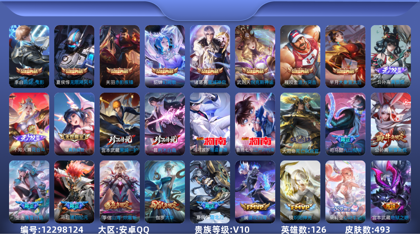 [12298124]V10 8典藏 3无双 4珍品传说 46传说 126英雄 493皮肤 典藏英雄武则天 女号 可修改实名 优质装备:倪克斯神谕(宇宙婆娘),无限飓风号(高达),活力突击,大秦宣太后,鸣剑·曳影,星域神启(倪克斯贼亮),赤影疾锋,幻阙歌(貂蝉典藏),真我赫兹(瑶)(瑶无双),花合斗,离恨烟(公孙离无双),江户川柯南,怪盗基德,朽木白哉,黑崎一护,黄金狮子座,黄金射手座,云鹰飞将(小将军),黄金白羊座,久胜战神,炽阳神光,一念神魔,末日机甲-孙尚香(绿蚂蚱),地狱火,地狱之眼,飞鸢探春,音你心动-周瑜,胖达荣荣,时之恋人-刘备(电焊工),游龙清影(小青龙),花朝如约(花篮子),无双飞将,音你闪耀(rap皮),山海·炽霜斩(李信年限),山海·琳琅生(小乔年限),灼幽烈阳,妄想奇谈,鹤归松栖(云缨),遇见神鼓,大乔-时之奇旅,霜月吟,澜逐花归海,艾琳觅芳踪,琥珀纪元铠,琥珀纪元马超,金乌负日,黄金天蝎座,朵莉亚心动手记,玄雷天君,涂山容容 传说皮:落雪白狼,死亡执政官,九山相柳,铠冥王哈迪斯 珍宝阁皮:妄想食味,优雅恋人,女武神,玩趣恶龙 限定皮:逐霄战戟,映山客,陌上桑,鸣野蒿,夏侯惇霜北刀,至尊宝,太华(伽罗年限),魔法小厨娘,神威(电光马子),飞衡(韩信年限),山海·碧波行(瑶年限),至美·乘鲤谣,遇见飞天,高山流水,齐天大圣,匿光决锋者,五谷丰年,冰锋战神,武圣,游园惊梦,梁祝,御风骁将(吕布年限),龙胆,虎魄,奔雷神使(牛魔年限),祈雪灵祝(雪兔子),李小龙,如梦令-嫦娥,如梦令-后羿,圣诞老人,孙行者,猪悟能,引擎之心,青春决赛季,冰霜恋舞曲,美猴王,匿光追影者,女儿国国王,寅虎·御盾(廉颇年限),唐三藏,匿光启智者,天降福星,梦圆繁星,山海·玄木吟(马可年限) 史诗皮:鸭鸭历险记-刘禅,灵蛊蚀心,星界战将,龙之律动,石田雨龙,百相守梦-周瑜,茶境仙,幻珠鲛人,怒海争锋,撼地雄心,破空之剑,战舞者,涂山红红,东方月初,蒙犽顽岩魄,埋骨钱,芈月浮光幕影,海诺心动手记,琥珀纪元伽罗,蔬乡物语(鲁班七号),百相守梦-百里守约,百相守梦-黄忠,织梦人,紫霞仙子,苍穹之光,电玩小子(小书包),黄金分割率,特工魅影,千年之狐,永昼,江河有灵,末日机甲-莱西奥,鹤归松栖(赵怀真),雪夜绮愿(周瑜),浮梦罗烟,完美假期,魅语,百解令(蒙犽),高渐离燃音魔法,